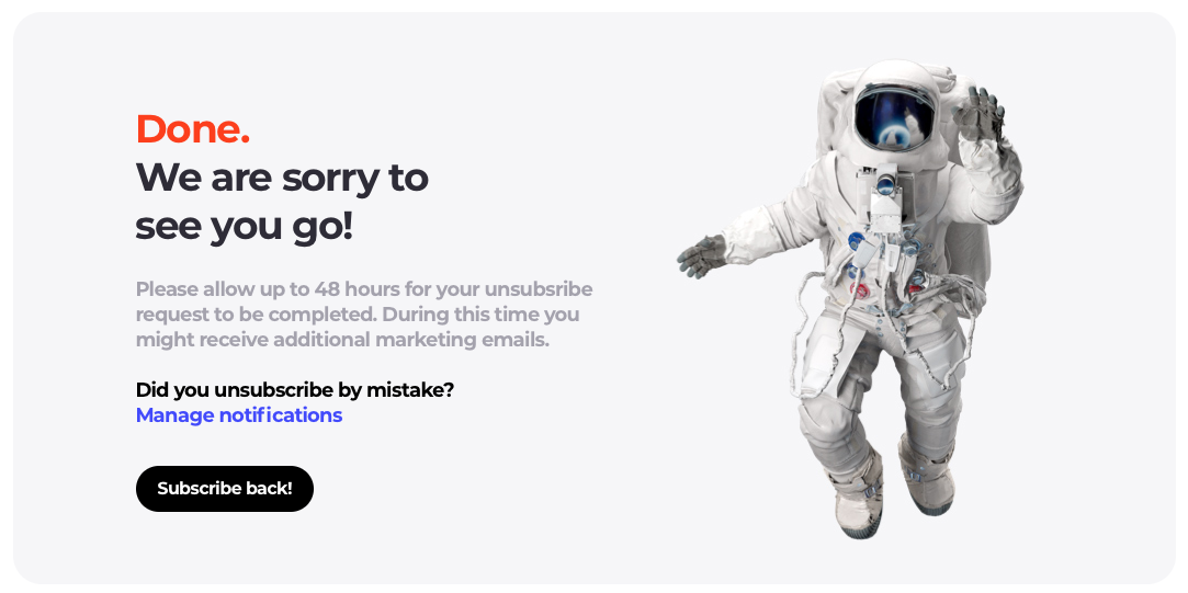 Design a landing page that confirms the unsubscribe action. This page should inform users that they have successfully unsubscribed and if desired, offer options to manage their subscription preferences.