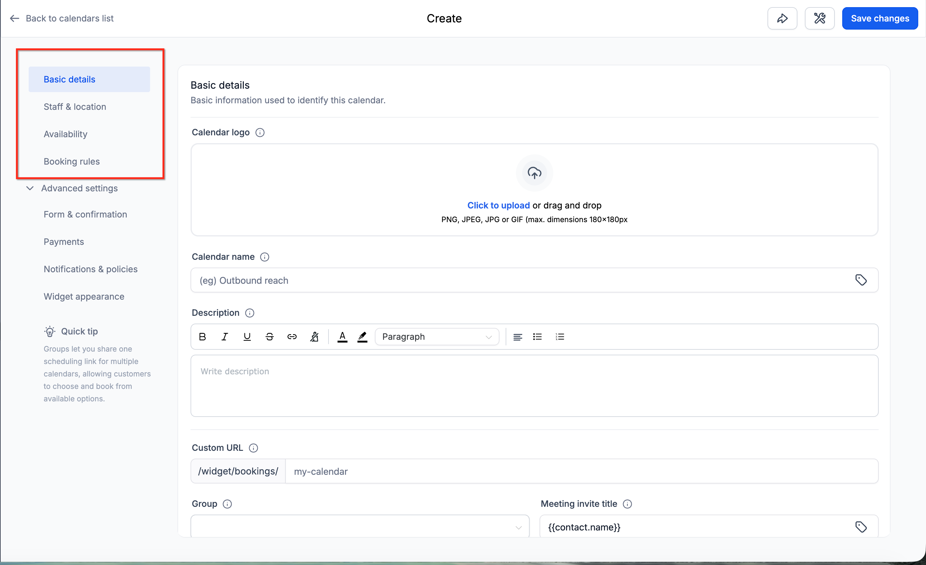 Calendar Settings are now grouped into sections to help you move faster: Basic details, Staff & location, Availability, Booking rules, and Advanced settings.