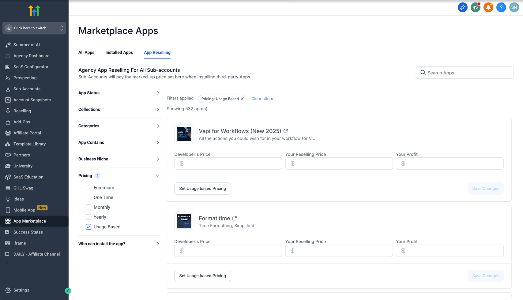 Go to App Marketplace → open the app → App Reselling (Usage‑Based).