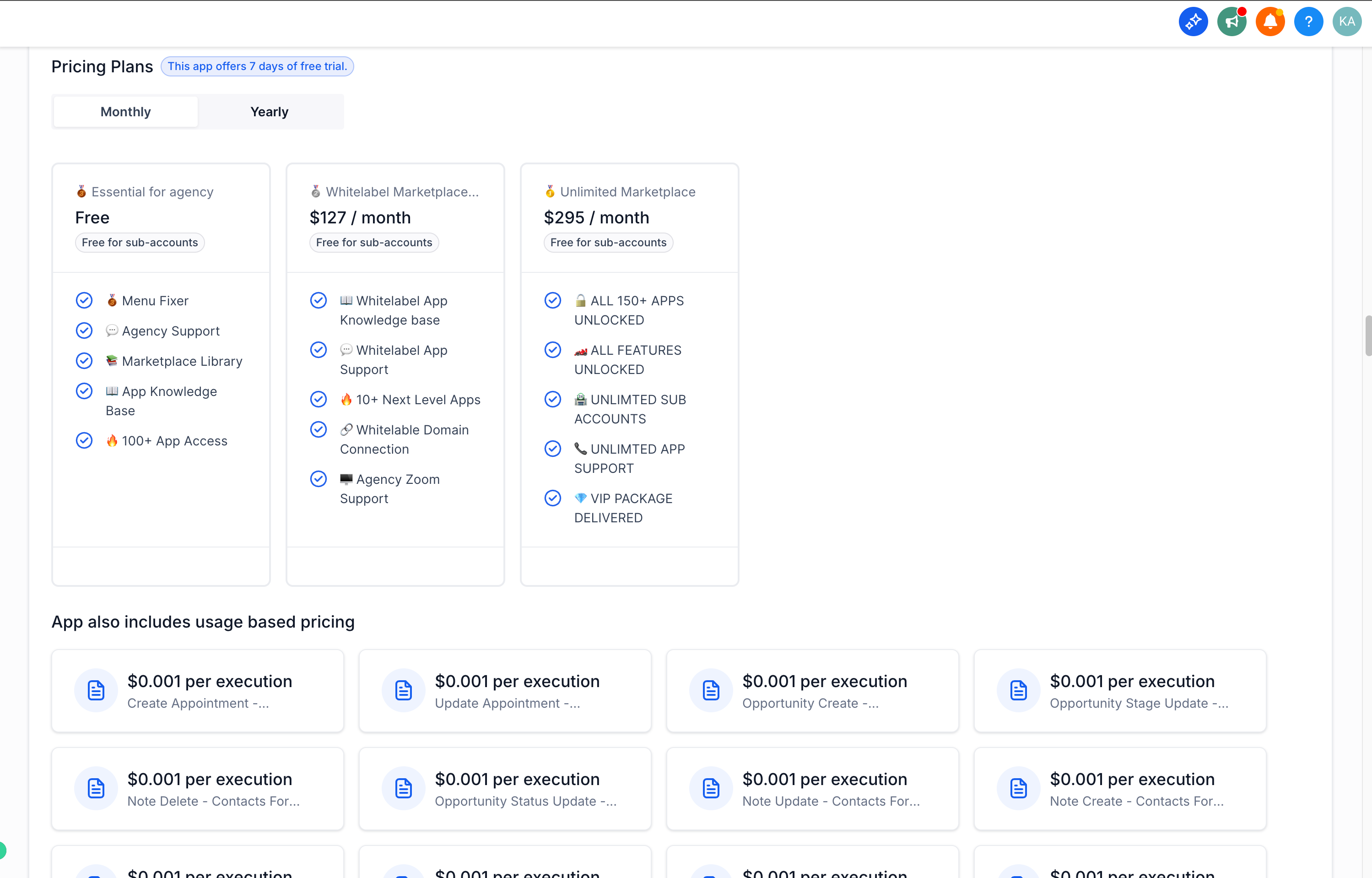 Usage‑based pricing covers three modules: per‑execution fees for Actions/Triggers, per‑message fees for Conversation Providers (with separate inbound and outbound rates), and custom per‑usage fees for app‑defined events posted through the Marketplace billing APIs. Agency rebilling applies an agency‑set markup to these per‑use charges and bills the appropriate wallet based on your rebilling setup.
