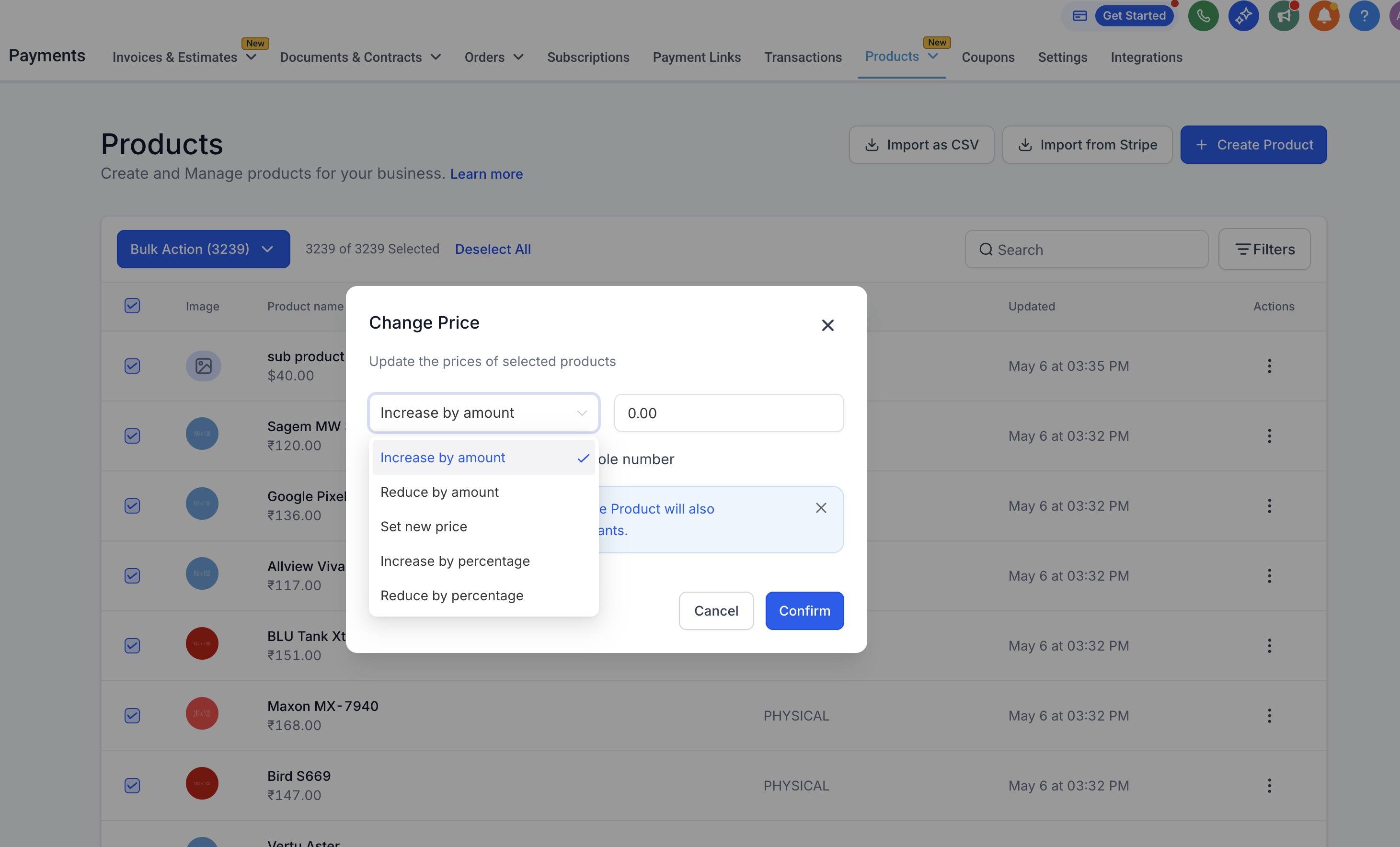 | Change Price | Increase, decrease, or set new prices across products using fixed values or percentages. |