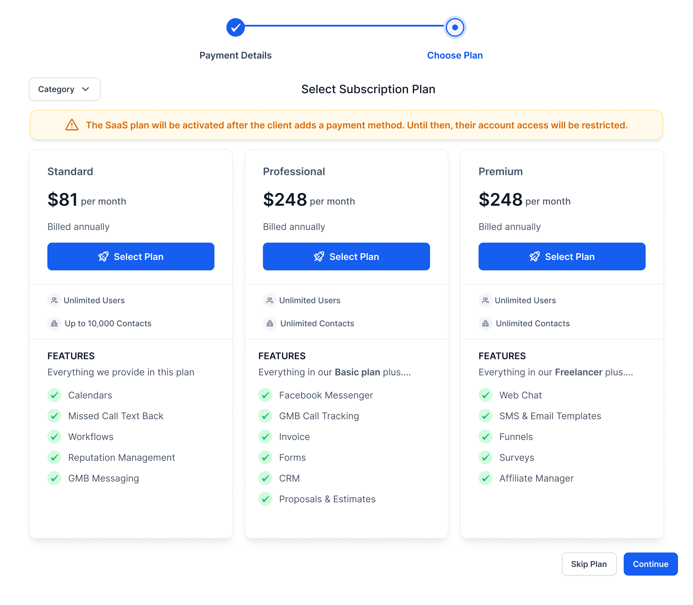 Important: A plan must be selected to activate SaaS mode. Clients must add payment methods for the plan to take full effect.