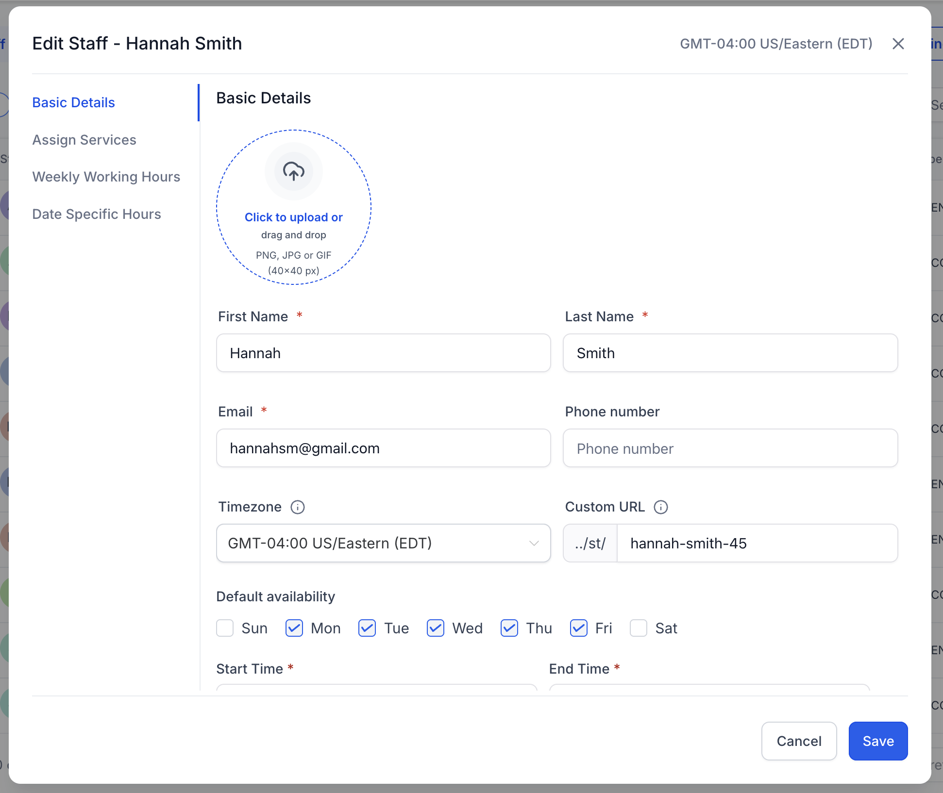 Profile Picture – Upload an image to represent staff on booking/scheduling pages.