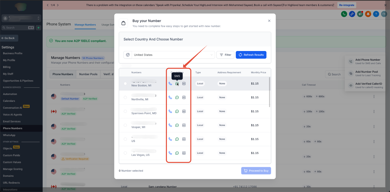 - Check that you are using a Lead Connector phone number with SMS capabilities. You can see your purchased phone numbers and their capabilities in Settings > Phone Numbers > Manage Number > +Add Number.