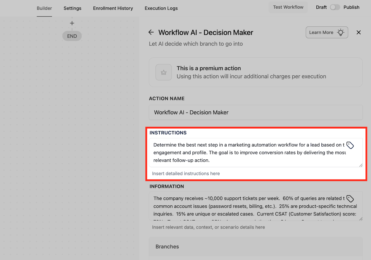 If the engagement score is under 30, send them to a re-engagement campaign.Important: To make smart decisions, the AI needs information about your contacts. Use the custom value picker (tag icon) to add contact fields, custom fields, or data from previous workflow steps. Without this context, the AI can't make informed decisions.Examples of useful information:
