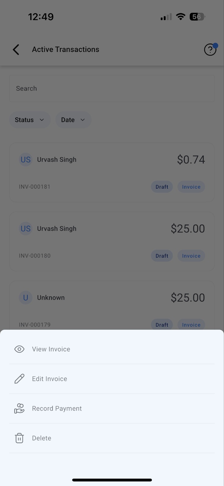 - To start collecting payment, swipe left on an invoice card or long-press it to reveal more options.