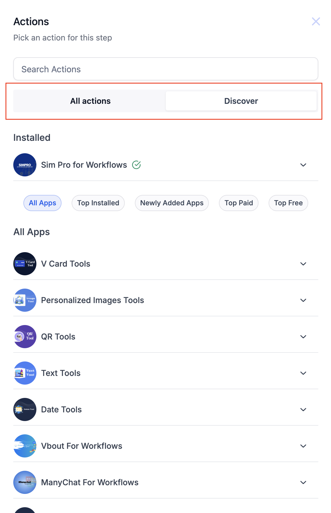 Inside the Workflow Builder, you’ll see a “Discover” button located within the action panel. Clicking this opens a full list of available marketplace apps without ever leaving your workflow. This integrated view brings convenience and clarity to app discovery.