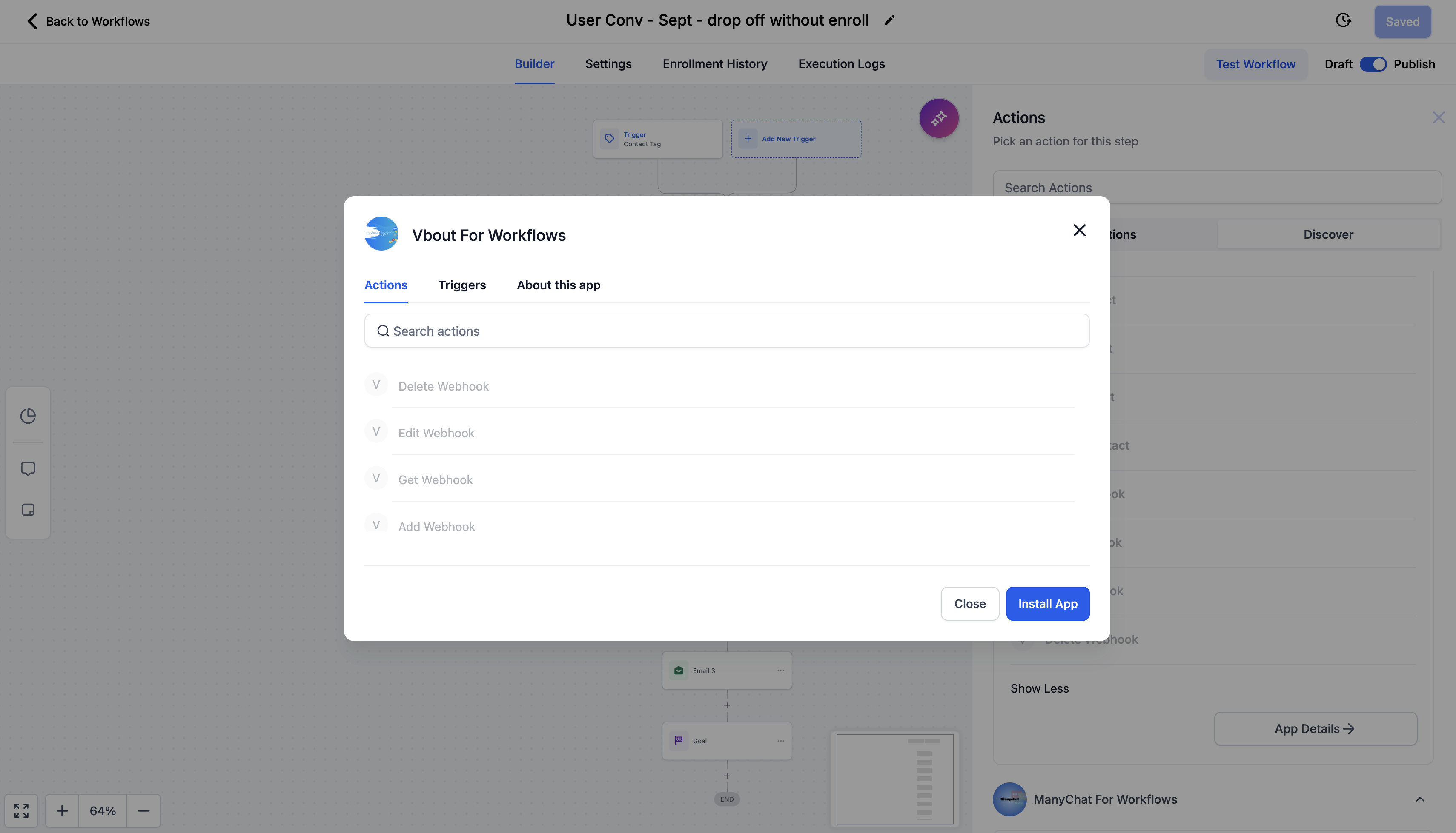 You’ll also see a prominent Install button that lets you add the app to your account instantly. After installation, the app’s actions and triggers will appear in your “All Actions” panel in the workflow builder, just like built-in steps.