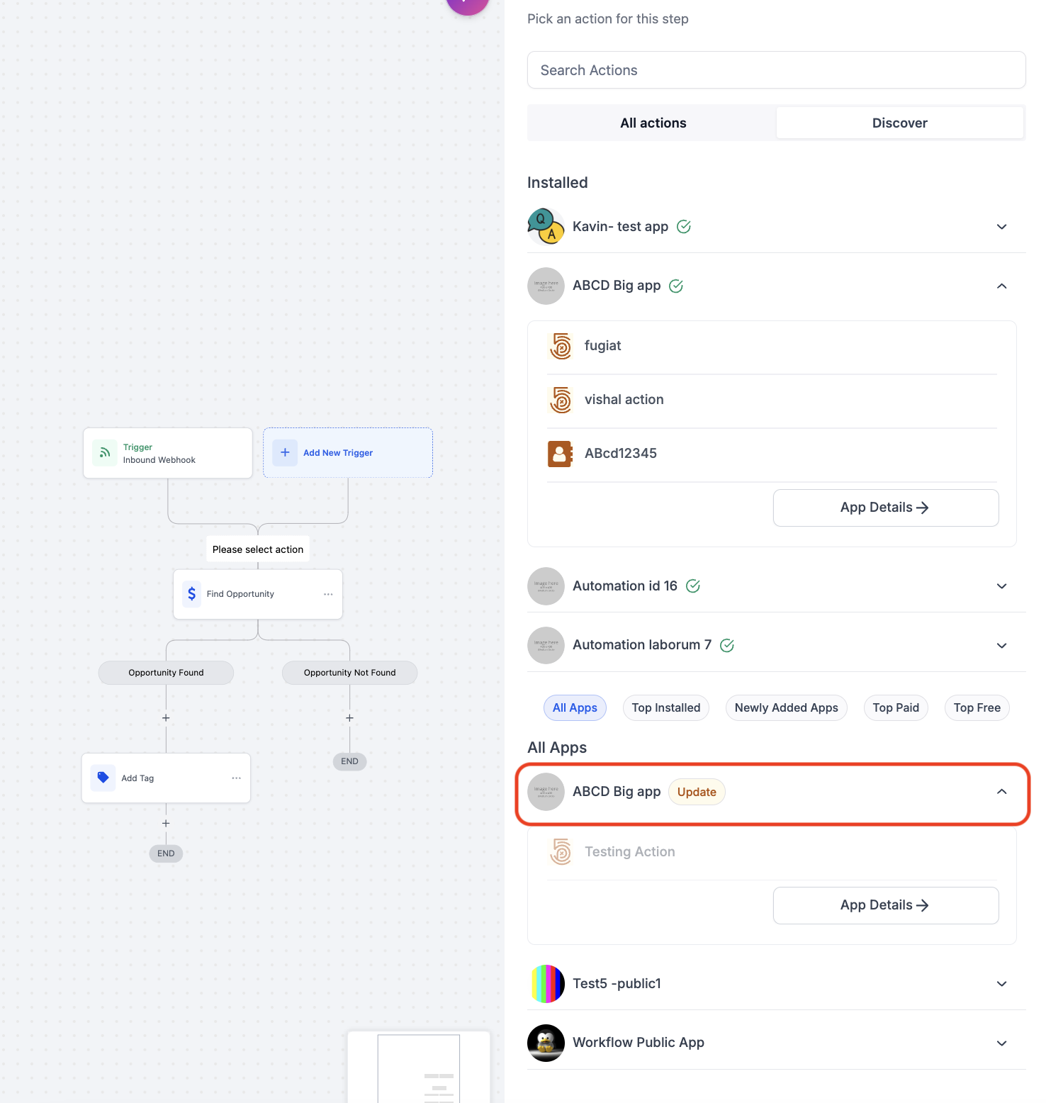 All installed app actions are accessible under the “All Actions” section in the workflow builder.