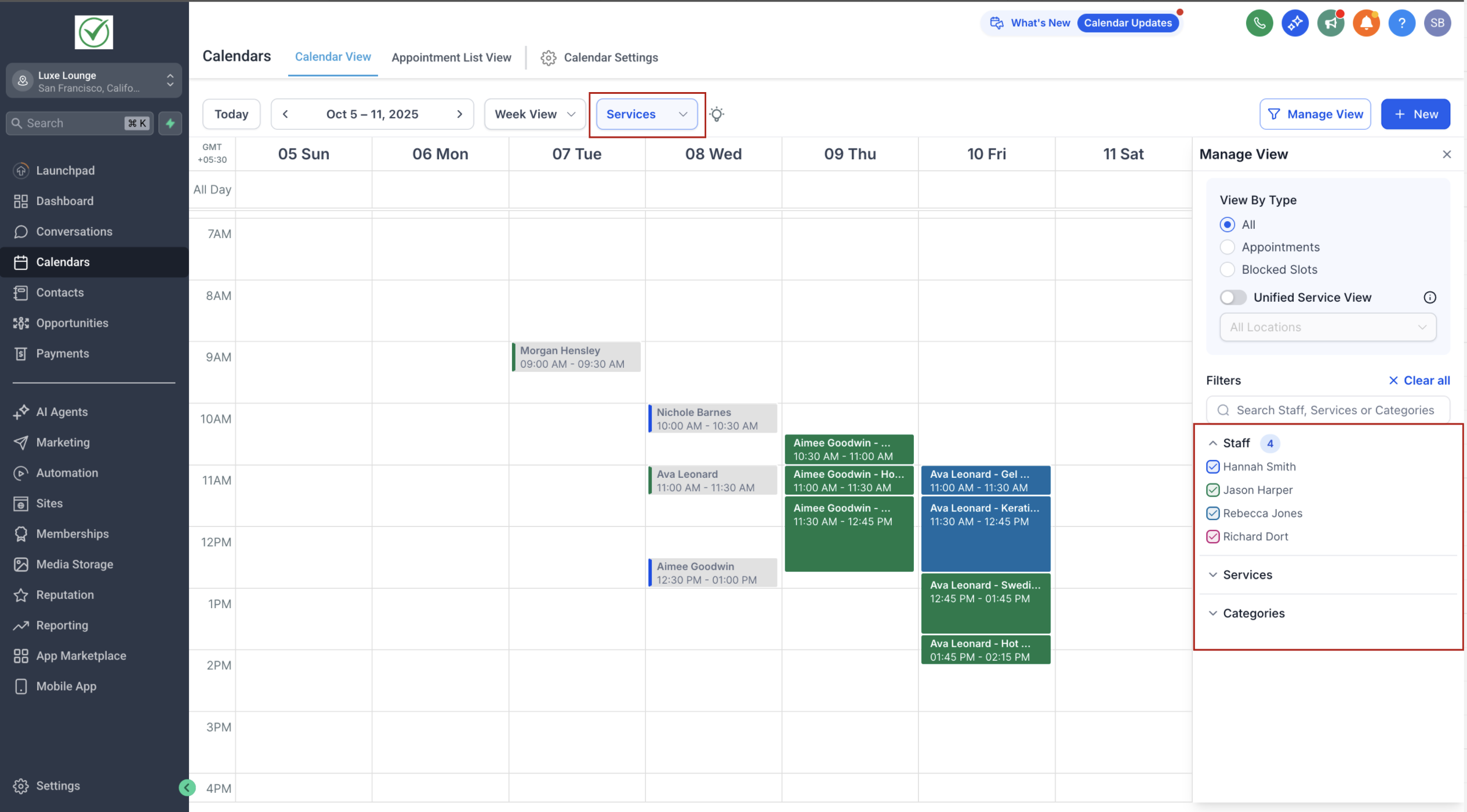 Use location filtering in Services View to focus on bookings in a specific branch.