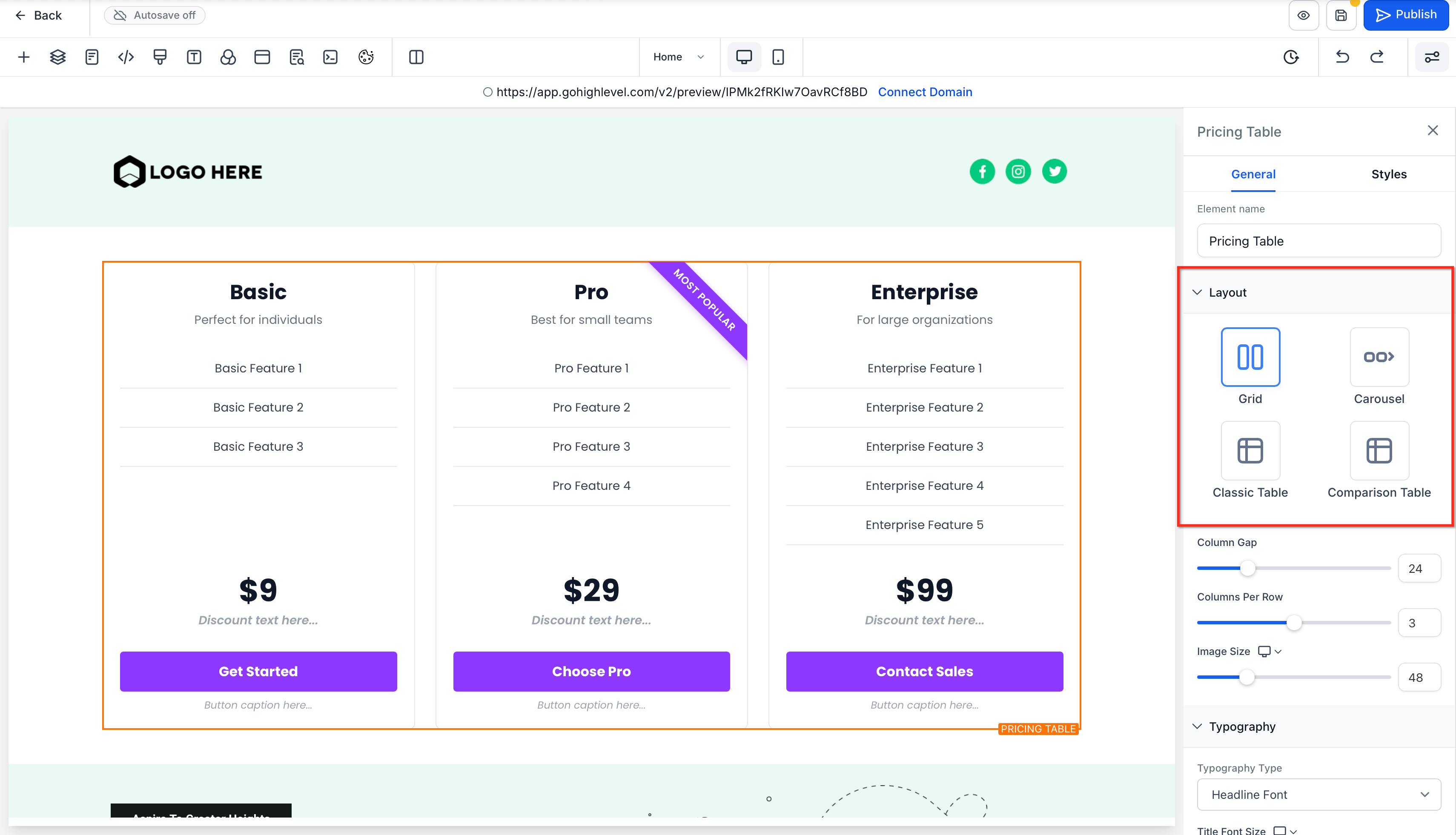 Layout flexibility: Choose Grid, Carousel, Classic Table, or Comparison Table to match your content and page goal.