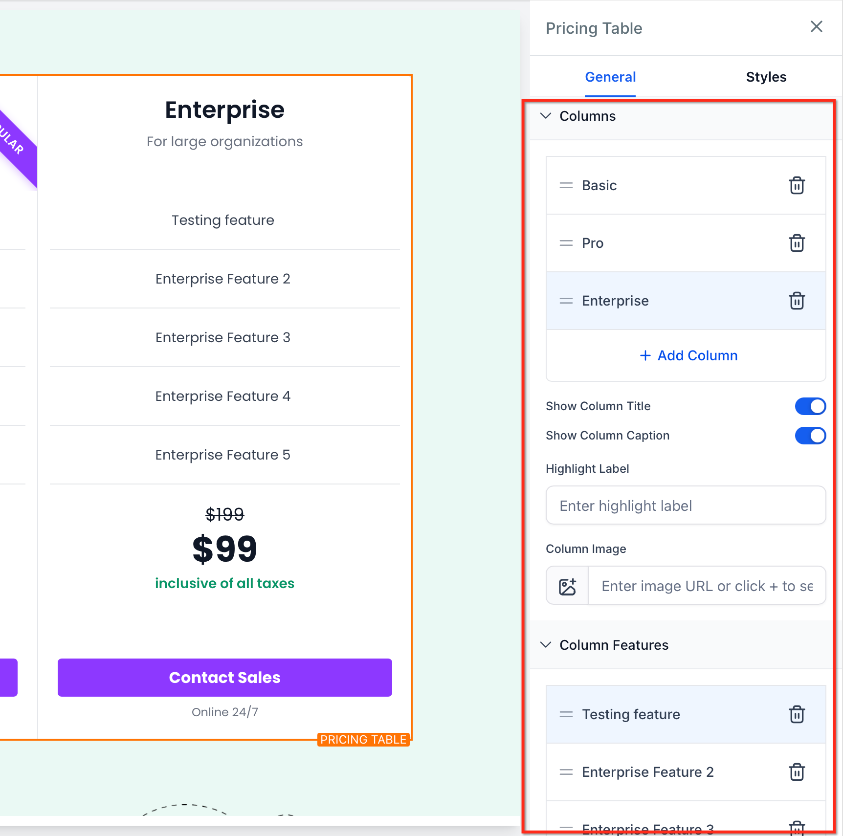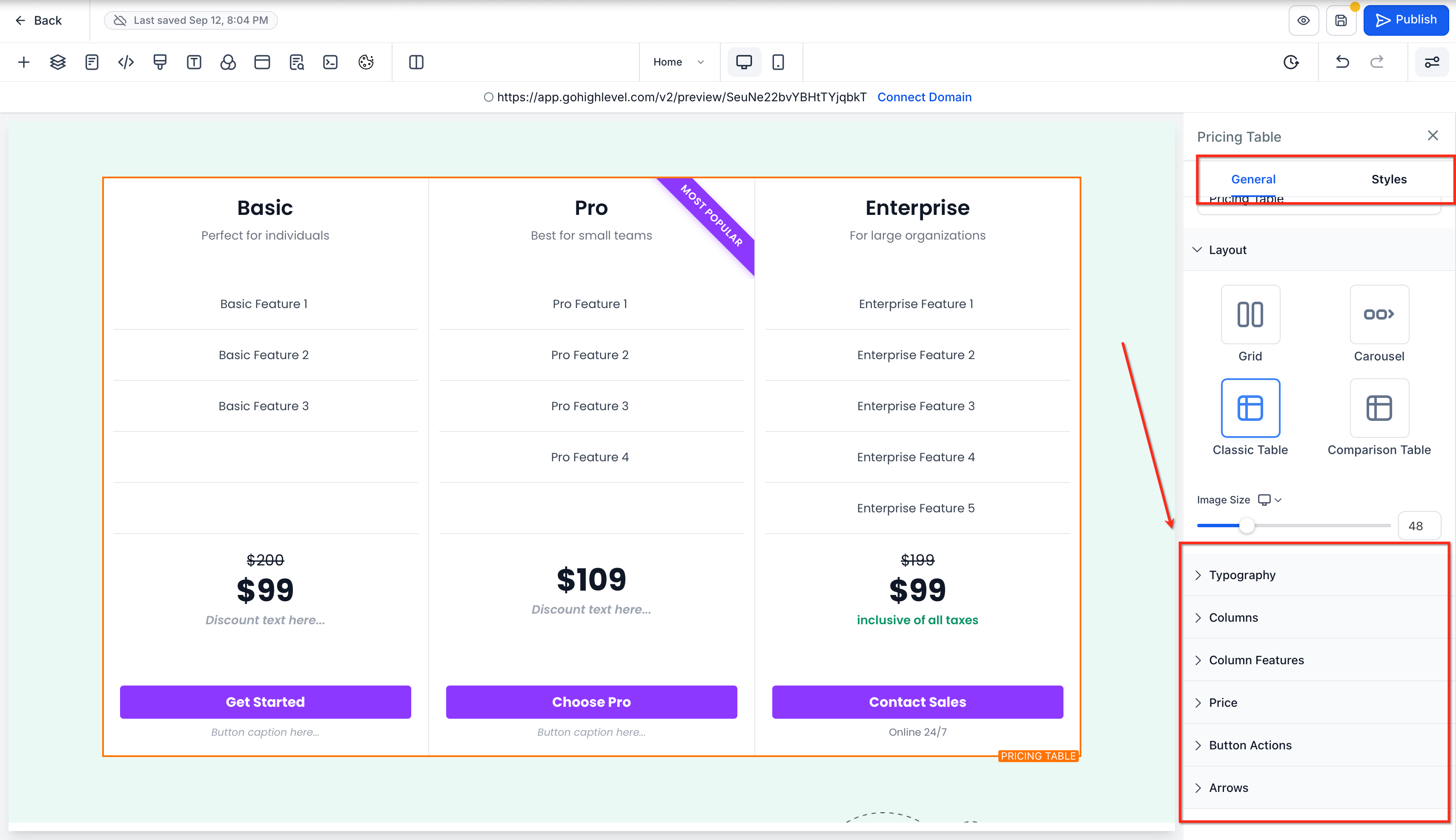 Configure the Layout (Pricing, features, buttons etc) and Styling of the pricing table.