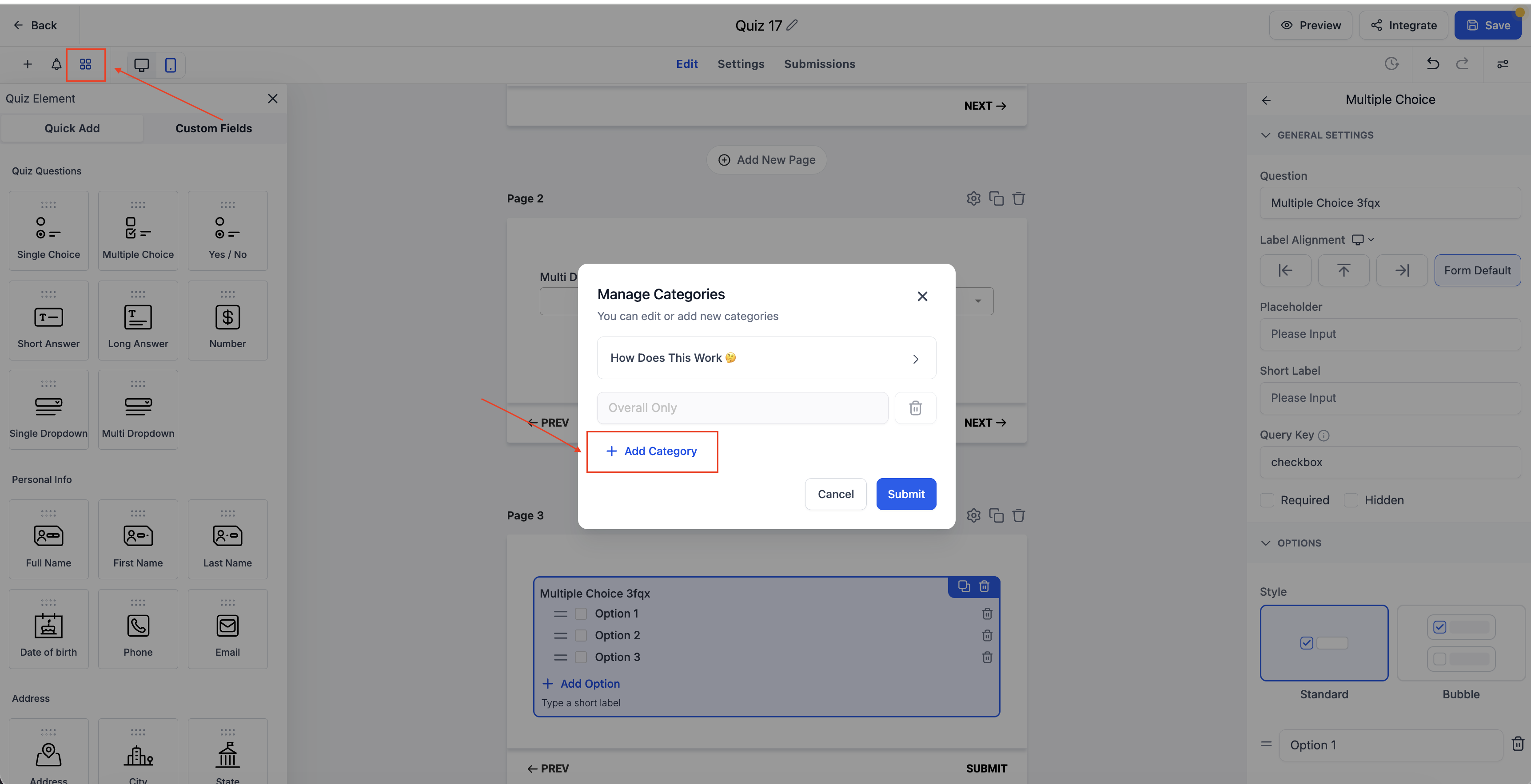 In the quiz builder, go to a question and look at the Options panel on the right. Under each answer, assign a Category and a Score