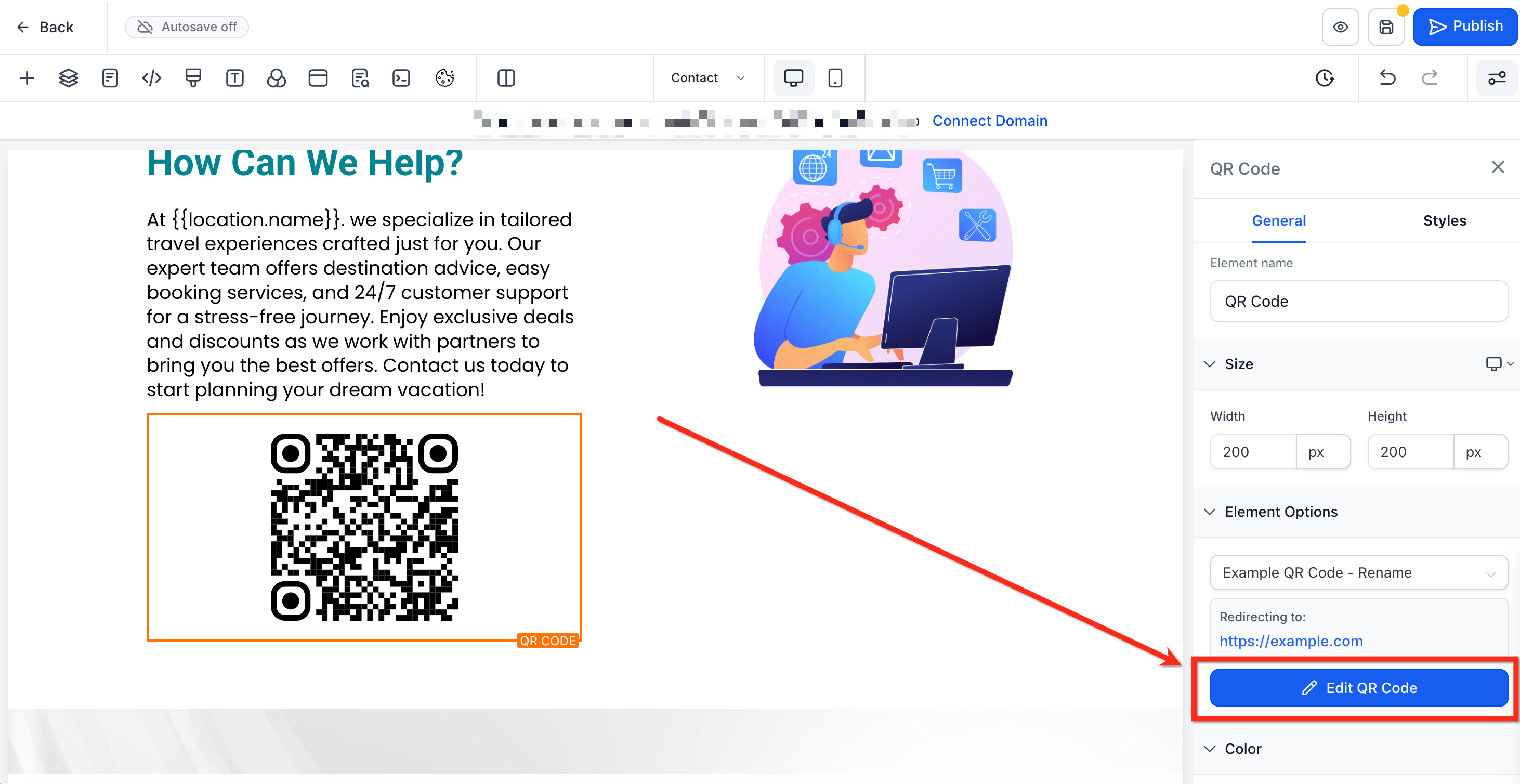 To edit the QR Code after element has been added, select the element. Click the blue button labeled Edit QR Code.