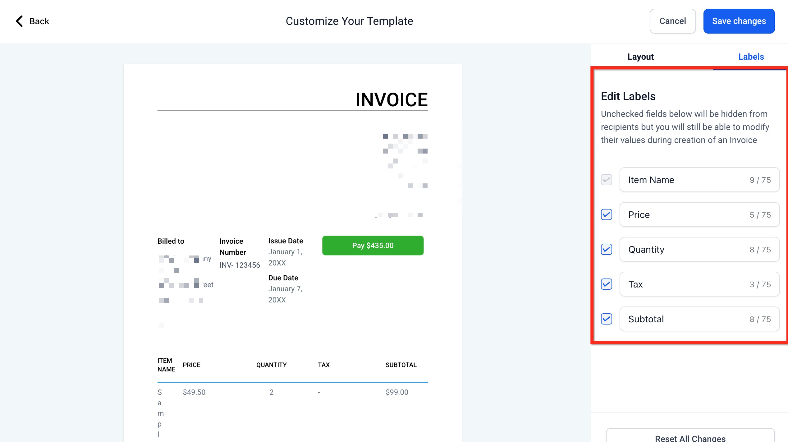 Tip: If you uncheck a label, that column is hidden from recipients; your team can still enter values during invoice creation.