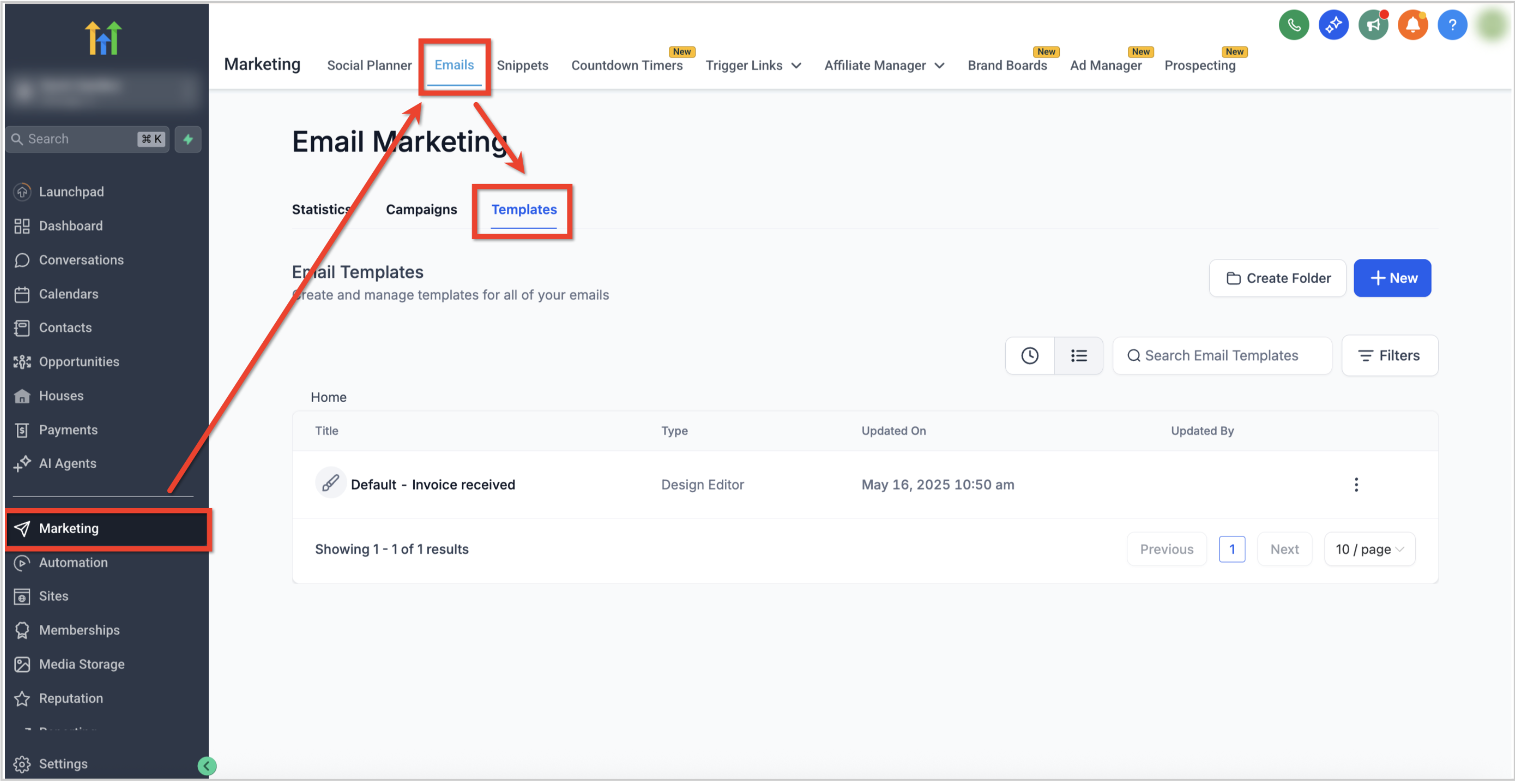 Navigate to Marketing → Emails → Templates from your sub-account dashboard.