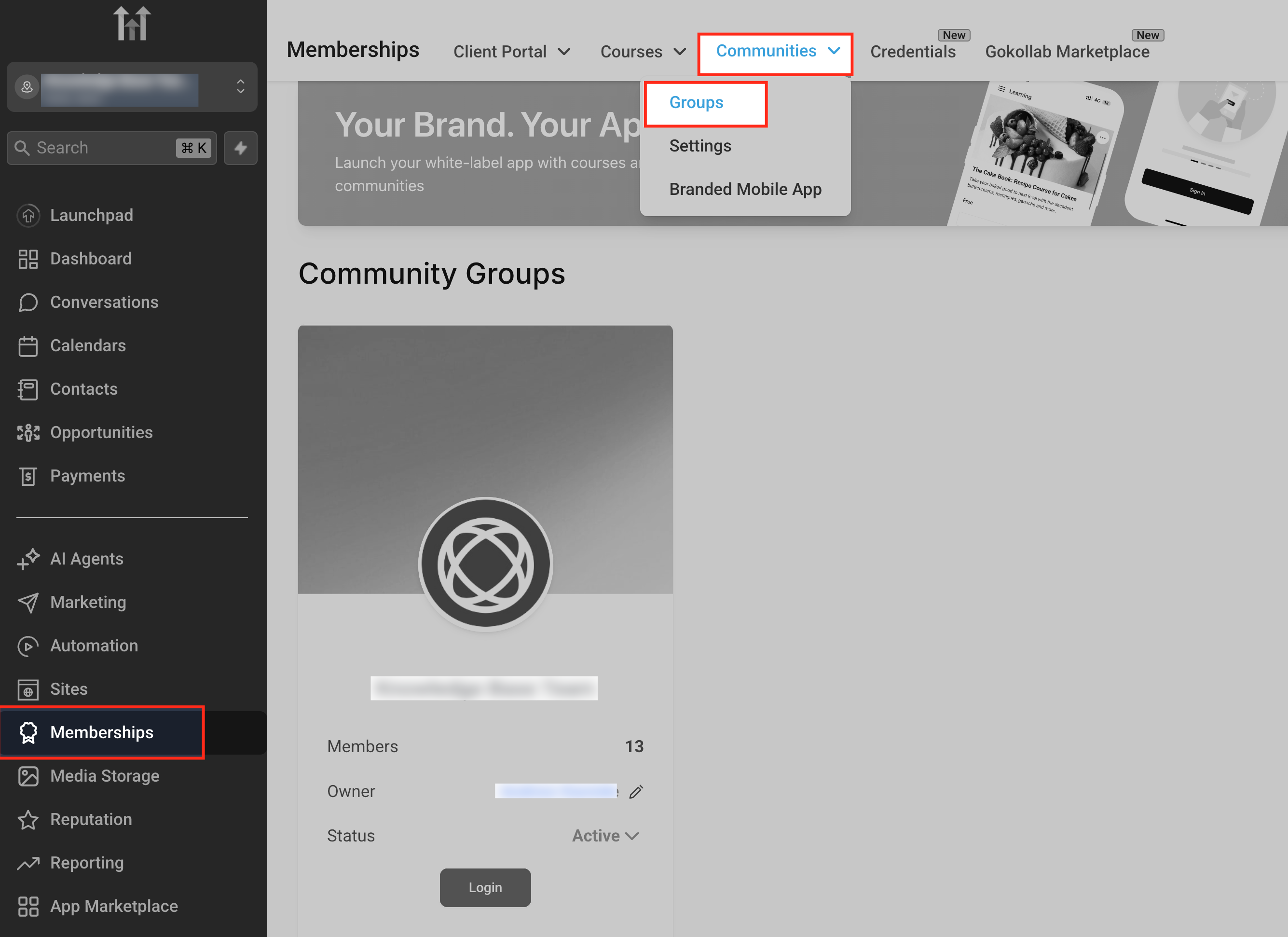 To access your community, begin by navigating to the Memberships section in your left sidebar. From the top navigation bar, hover over Communities, then click Groups.