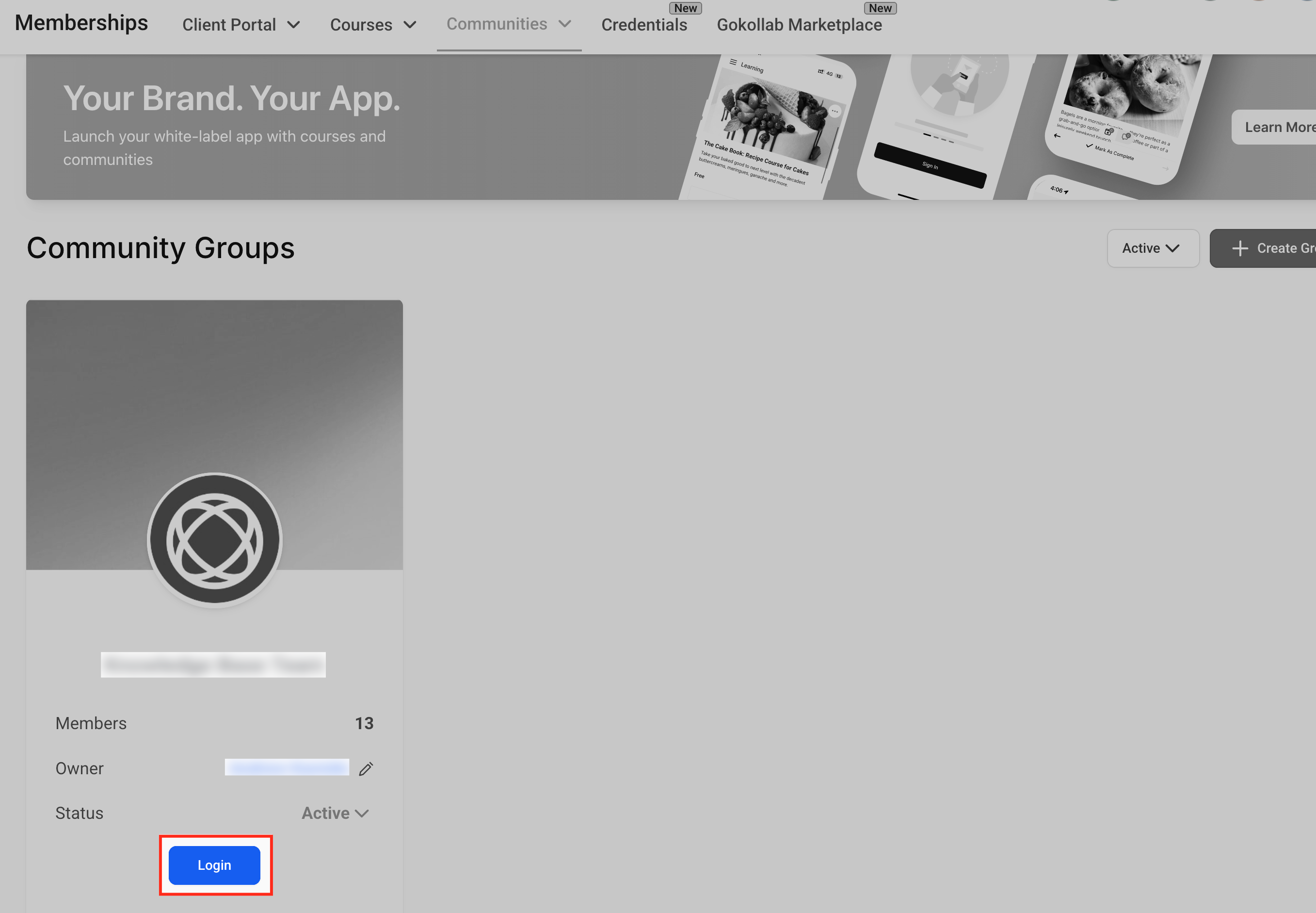 On the Community Groups page, locate the community you want to manage. Click the Login button to enter that community space.