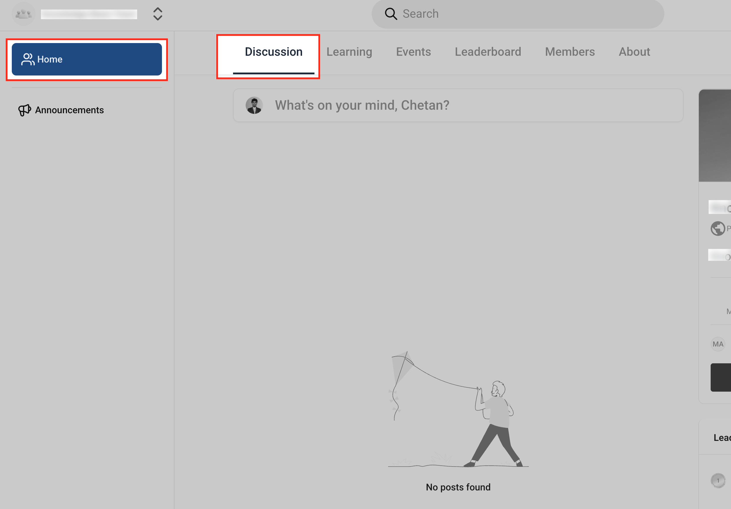 Once inside the community, you will land on the main home screen. Select the Discussion tab from the top navigation to begin creating or managing posts.