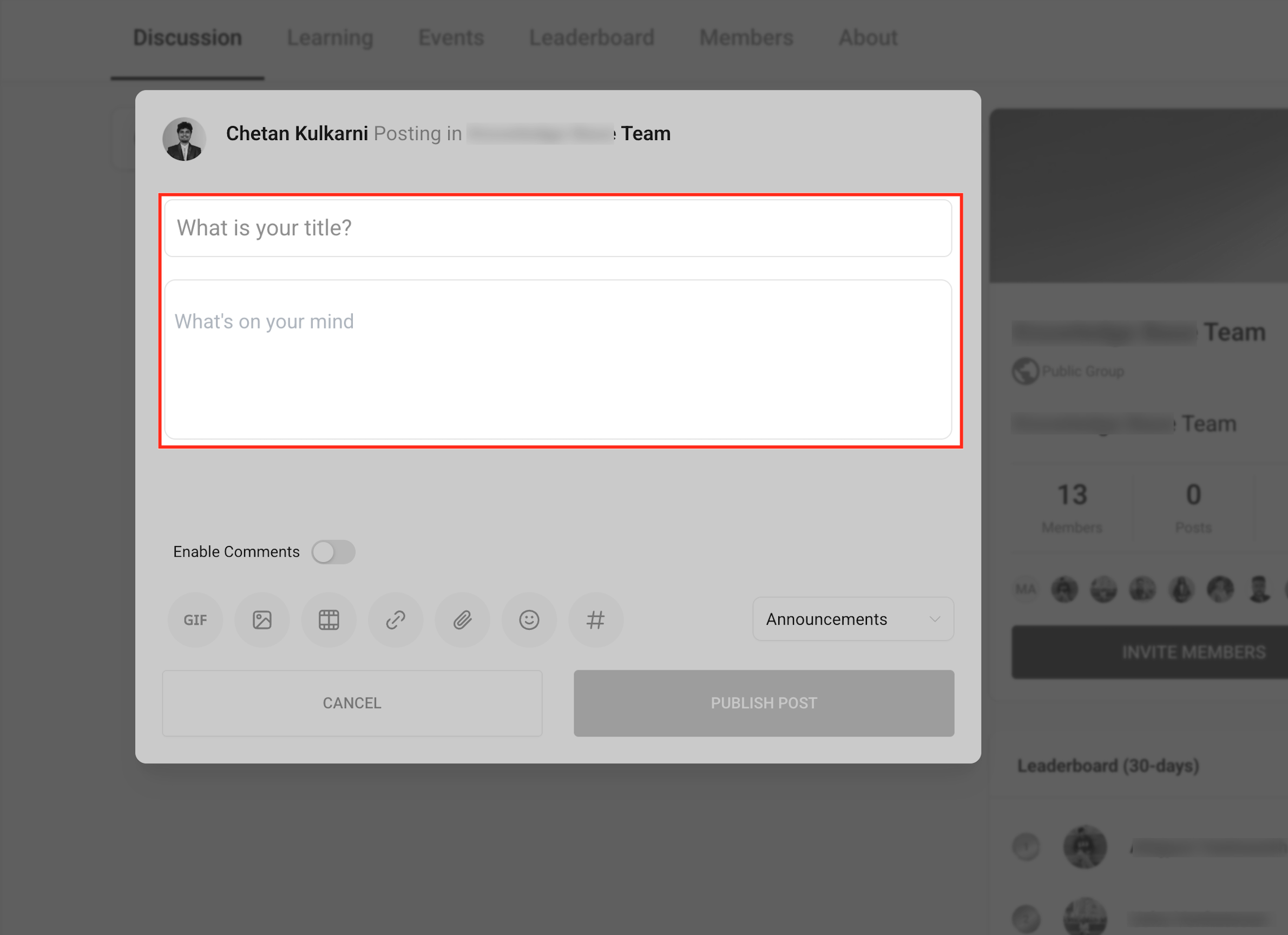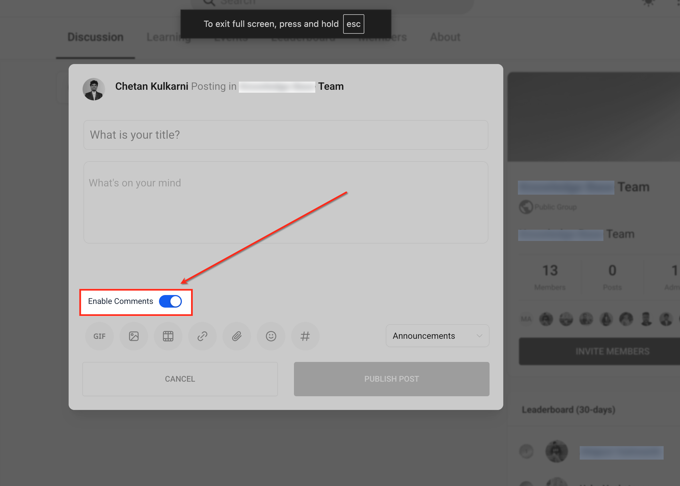 Click into the post creation box where you can add your post title and content. Here, you will also see the Enable Comments toggle, which lets you decide whether members can reply.