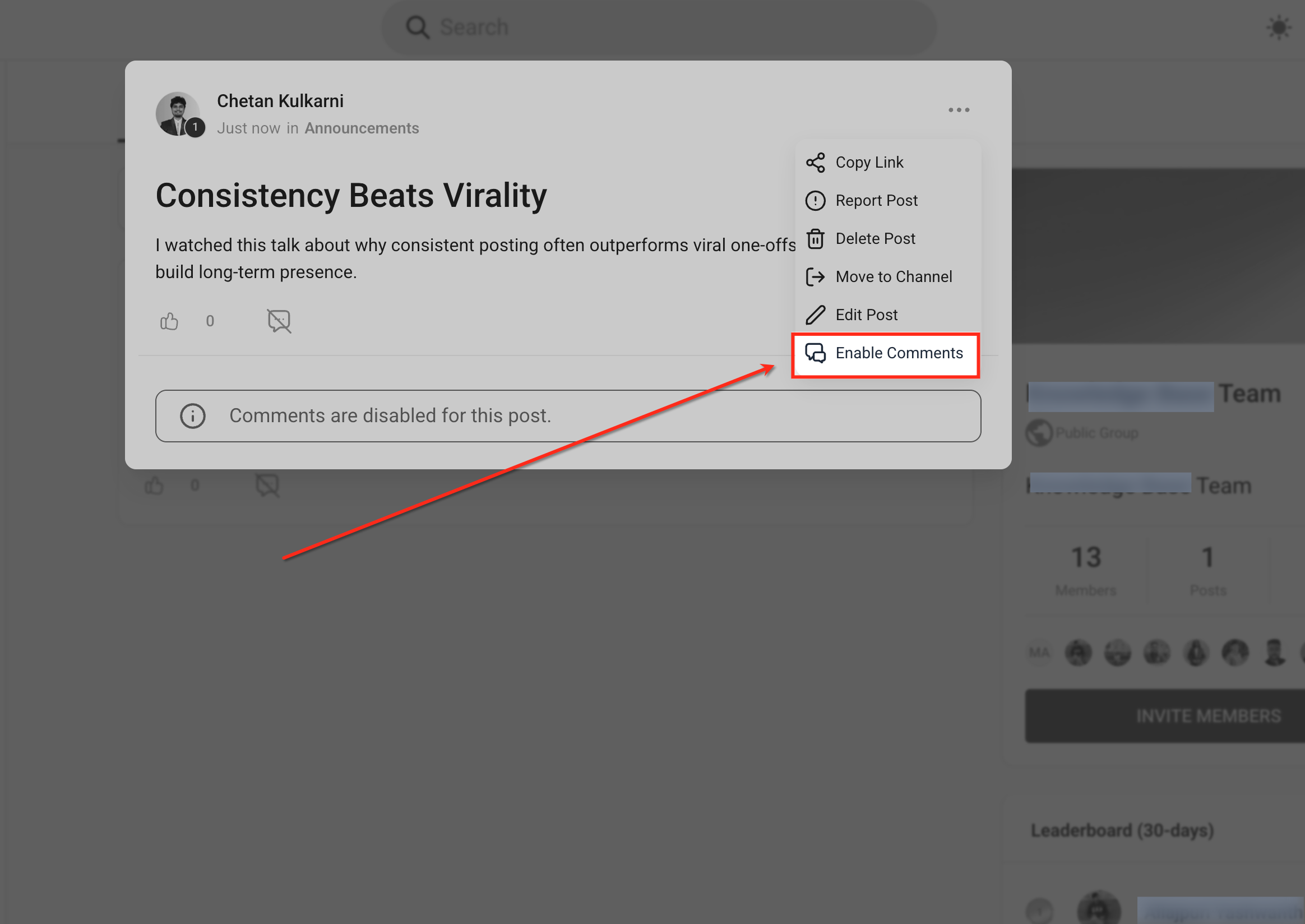 After a post is published, the post author, channel managers, and workspace admins can change comment settings at any time. Simply open the three dots menu on the post and select Turn off comments or Turn on comments.
