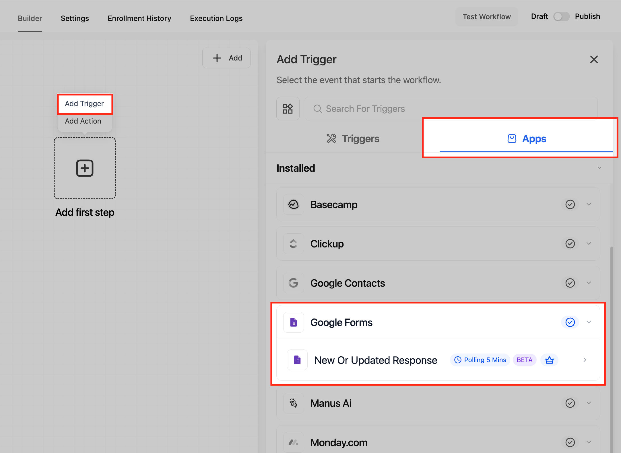Go to Automation > Workflows and begin adding Google Forms triggers or actions to your workflow.