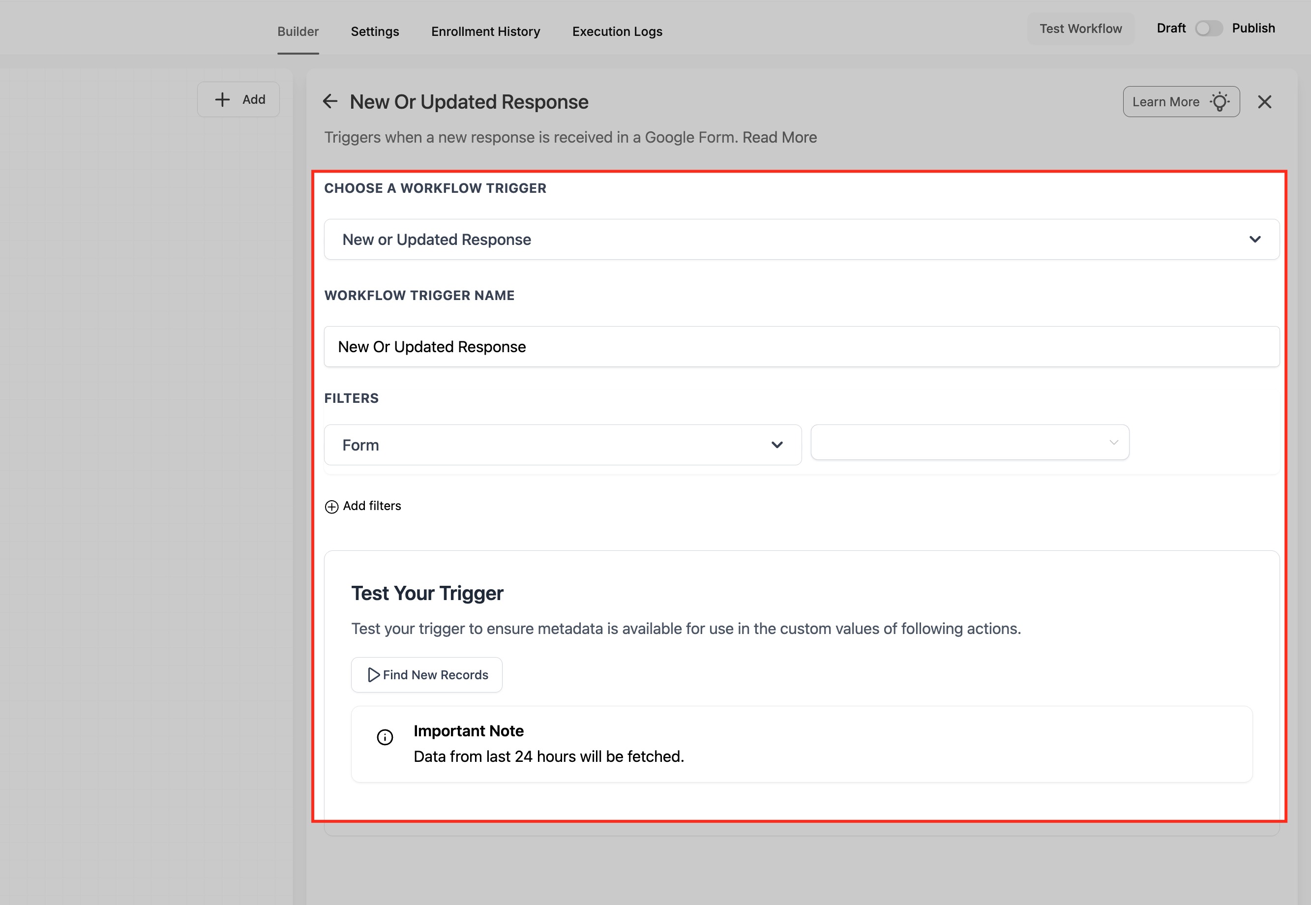 Google Forms supports both triggers and actions in HighLevel Workflows. Triggers let a workflow begin when a Google Form response is detected, while actions let you search for forms or response data during an automation.