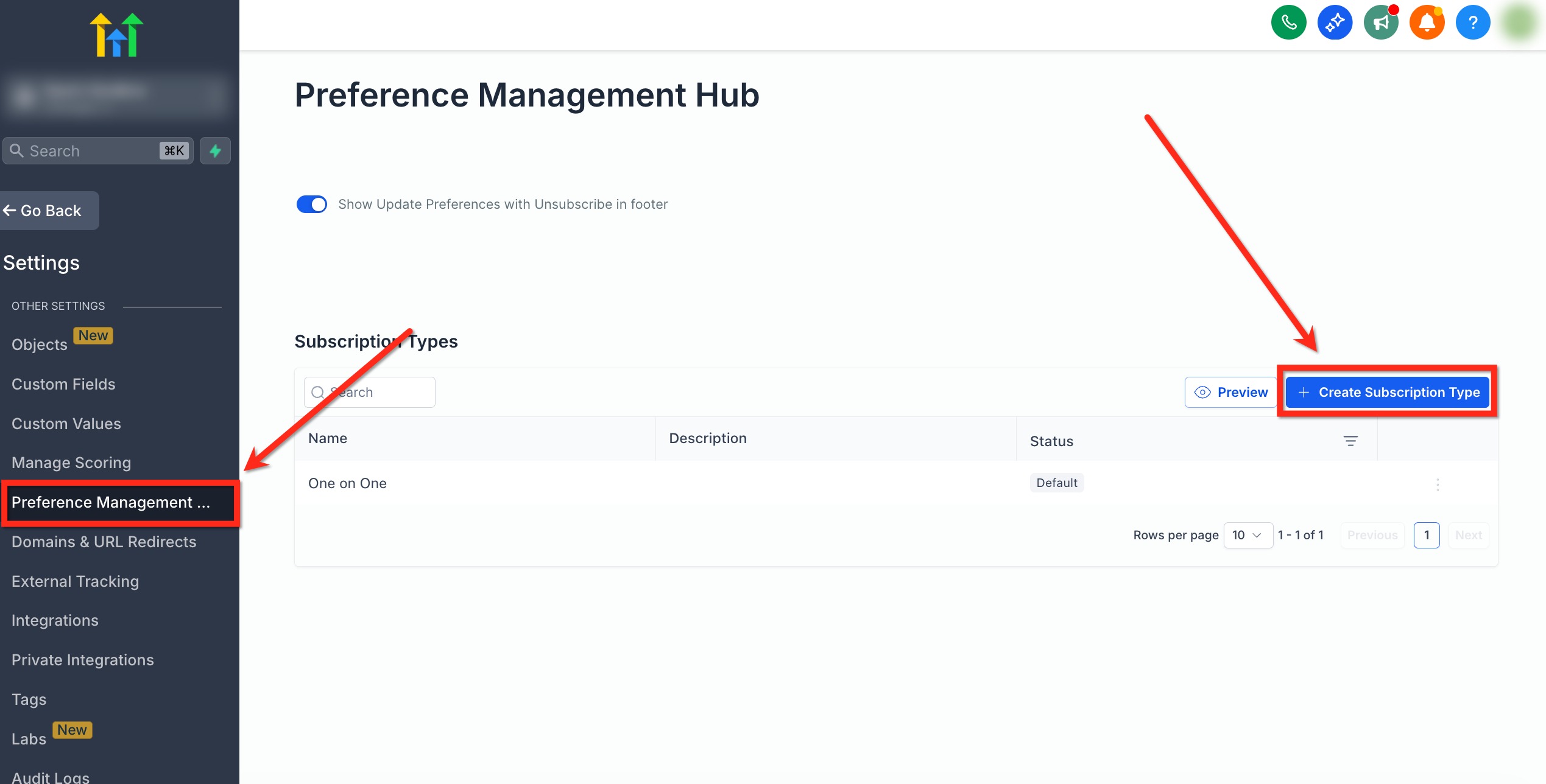 1. Go to Settings → Preference Management Hub at the location level.