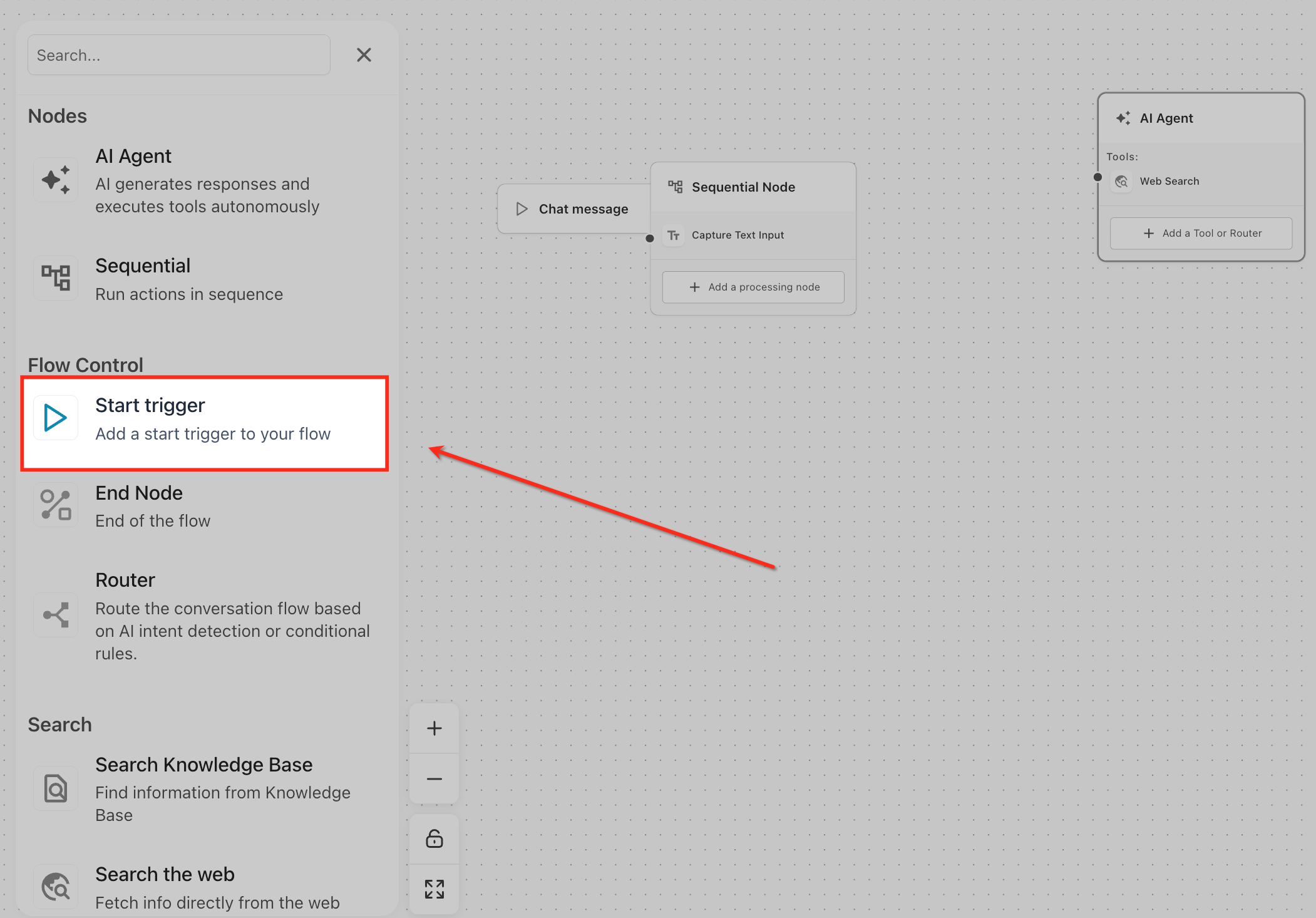 From the node picker, choose Start trigger under Flow Control. This places a trigger tile that listens for events to start your agent.