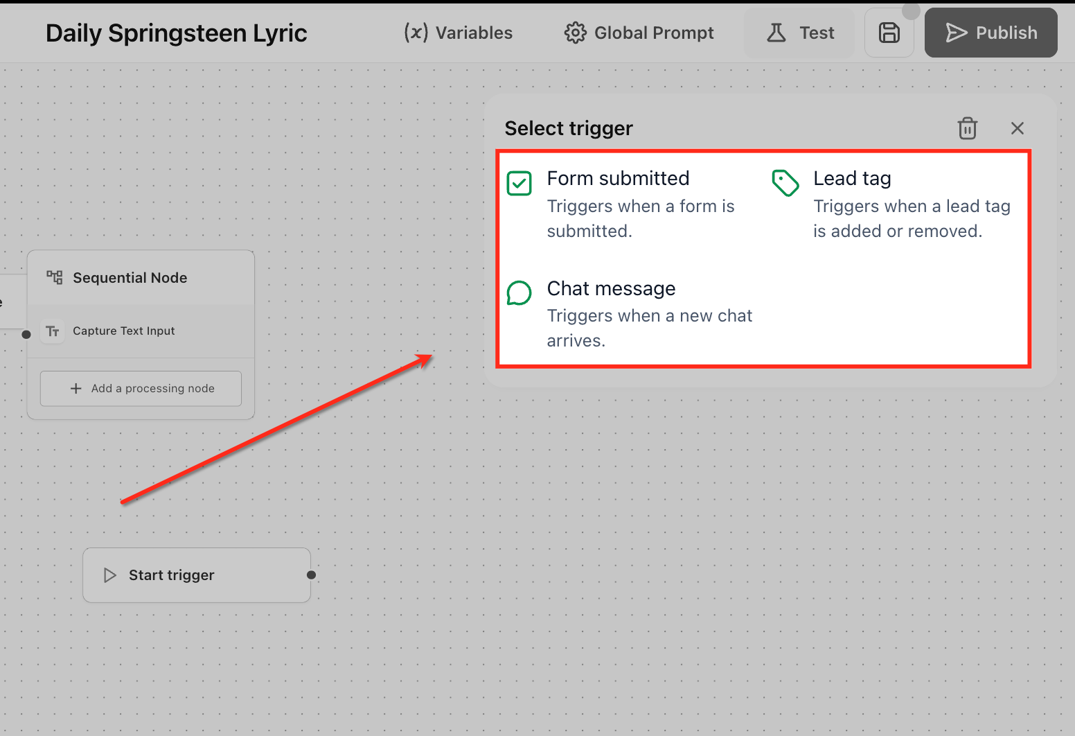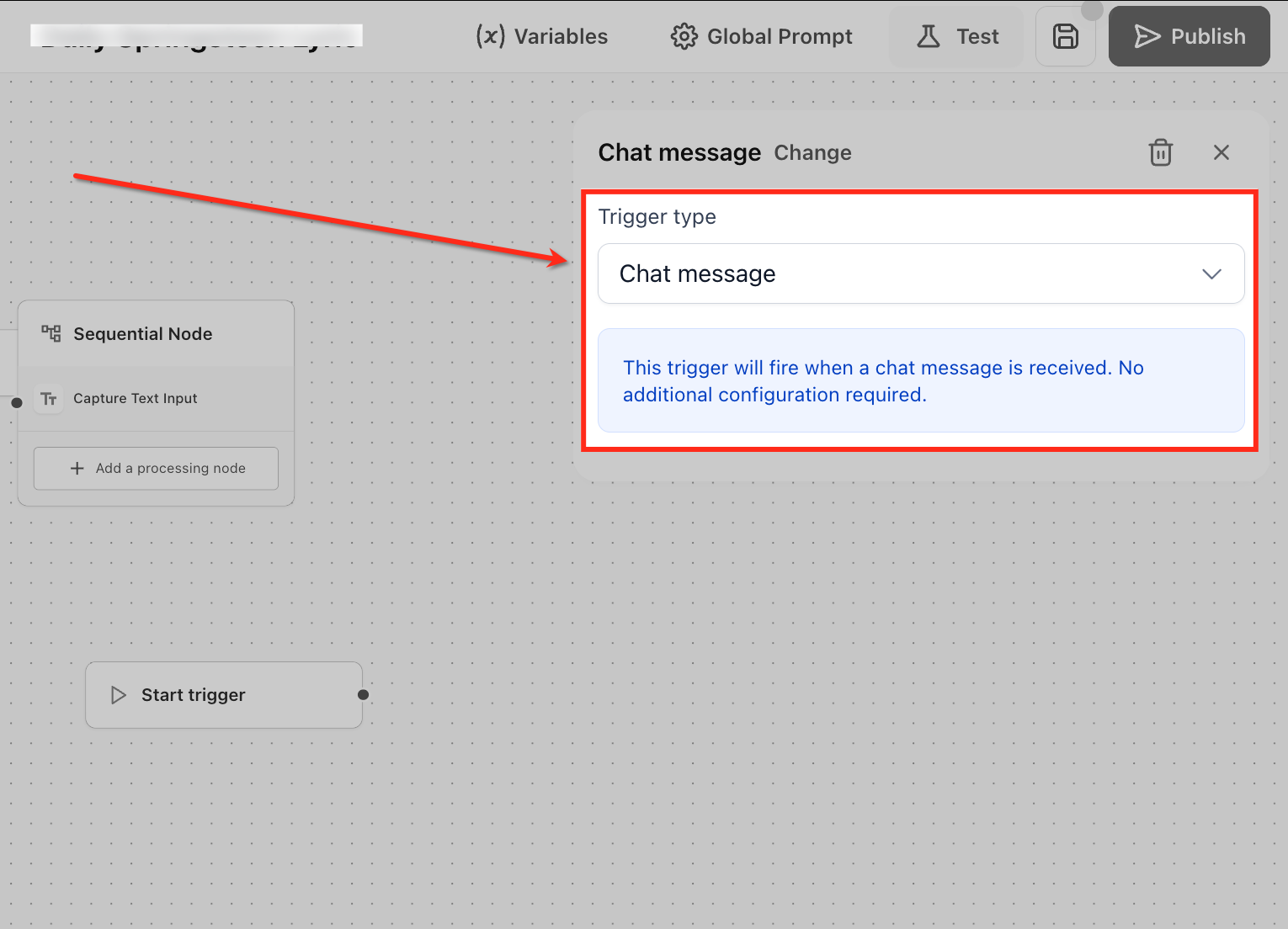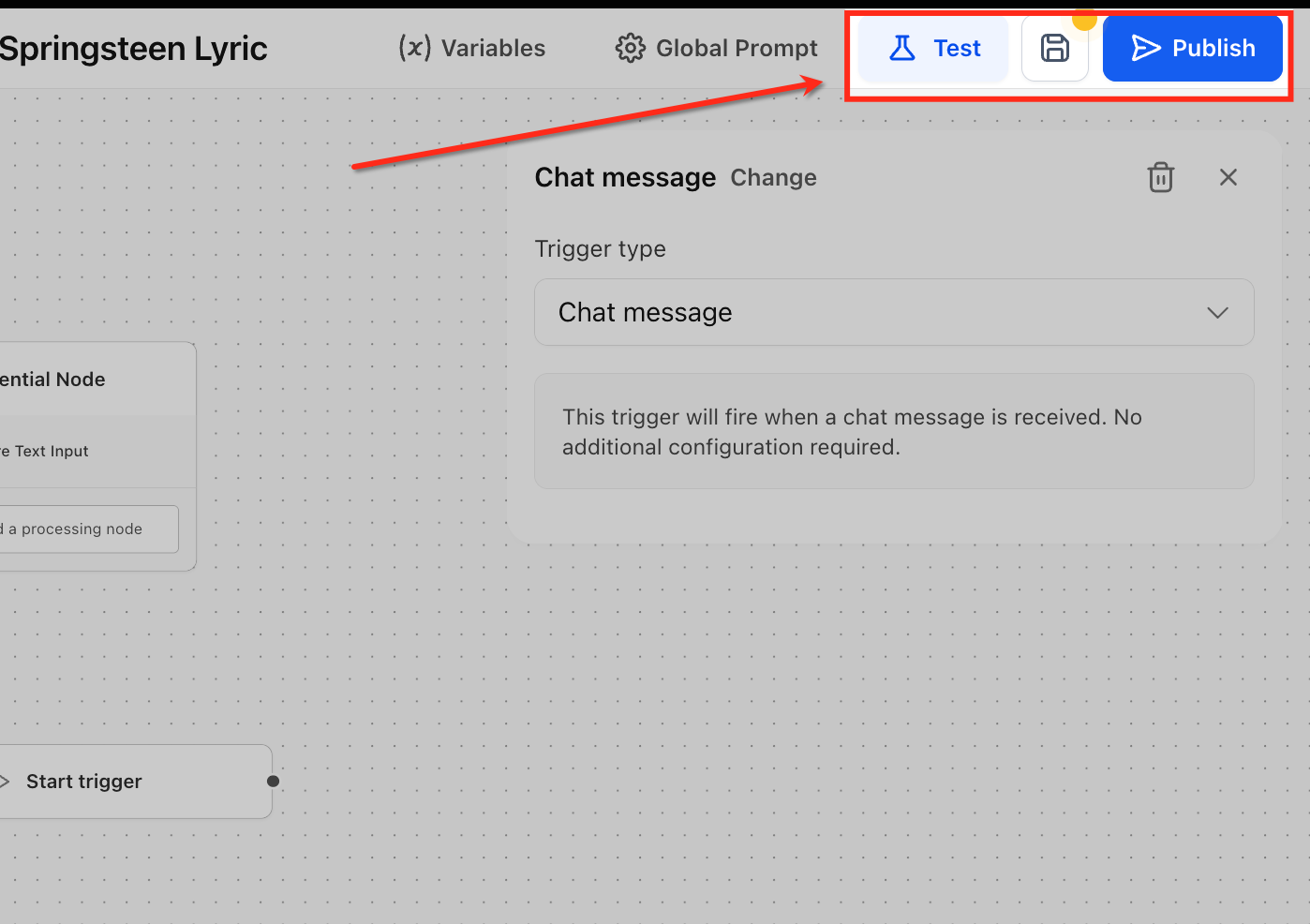 - Test: Run a safe simulation of the selected trigger to see exactly which variables and payload the agent receives, no live contacts are affected. Use this to iterate quickly on prompts/nodes and verify the flow before publishing.