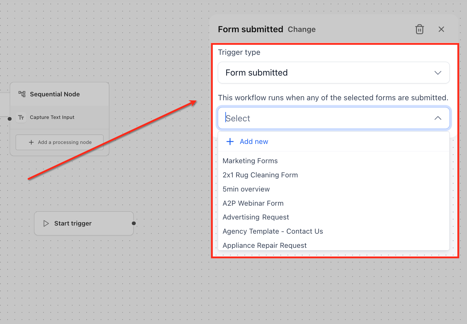 For Form submitted trigger, use the dropdown to choose one or more forms, or click Add new if the form isn’t created yet. The agent will start whenever any selected form is submitted.