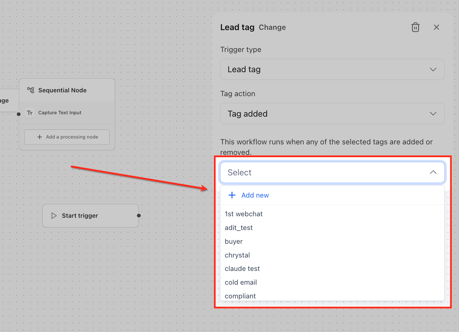For Lead tag, set Tag action to Tag added or Tag removed. This decides whether the agent starts when a tag is applied to a contact or when it’s removed.