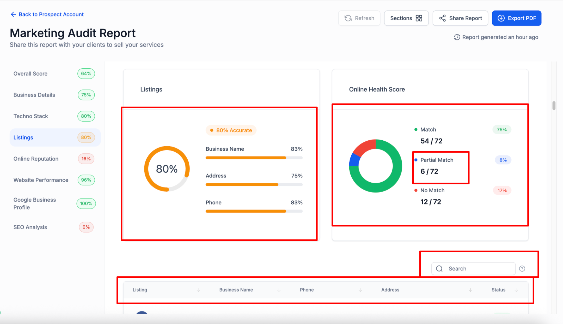 The Enhanced Listings Audit is a revamped experience inside Marketing Axudit Reports and Prospecting Reports that evaluates a business’s presence across major listing publishers. It standardizes match categories, auto‑selects relevant publishers based on country, and summarizes results with easy‑to‑read charts and sortable tables.