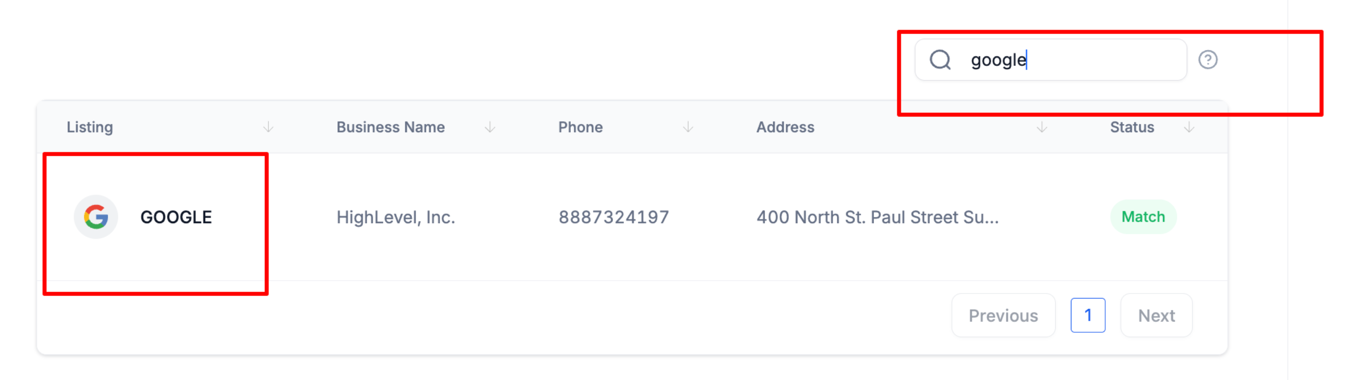 Sort: Click any column header (Listing, Business Name, Phone, Address, Status) to reorder.