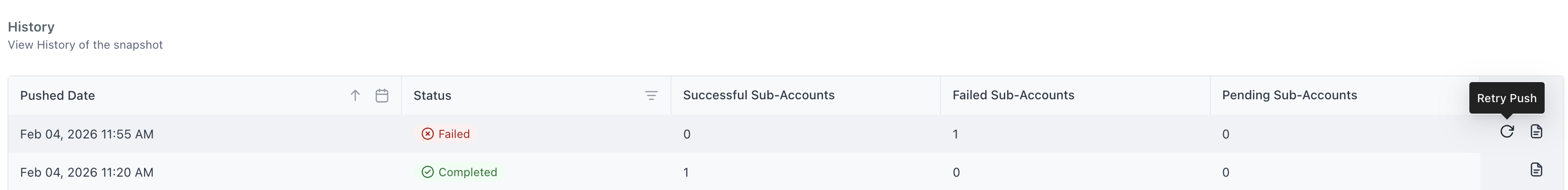 Snapshot Load Retry helps you quickly recover from snapshot pushes that fail for one or more sub-accounts. Instead of rebuilding a full push, you can retry only the failed sub-accounts directly from Load History and watch the retry progress update in real time. This is especially useful for resolving temporary errors like timeouts or account-specific permission issues.