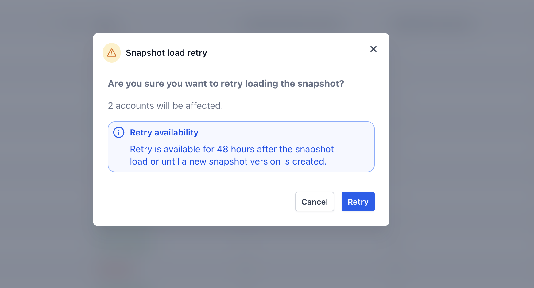 These safeguards help ensure retries remain reliable and prevent you from reloading outdated snapshot content into sub-accounts. Snapshot Load Retry is unavailable in these scenarios:
