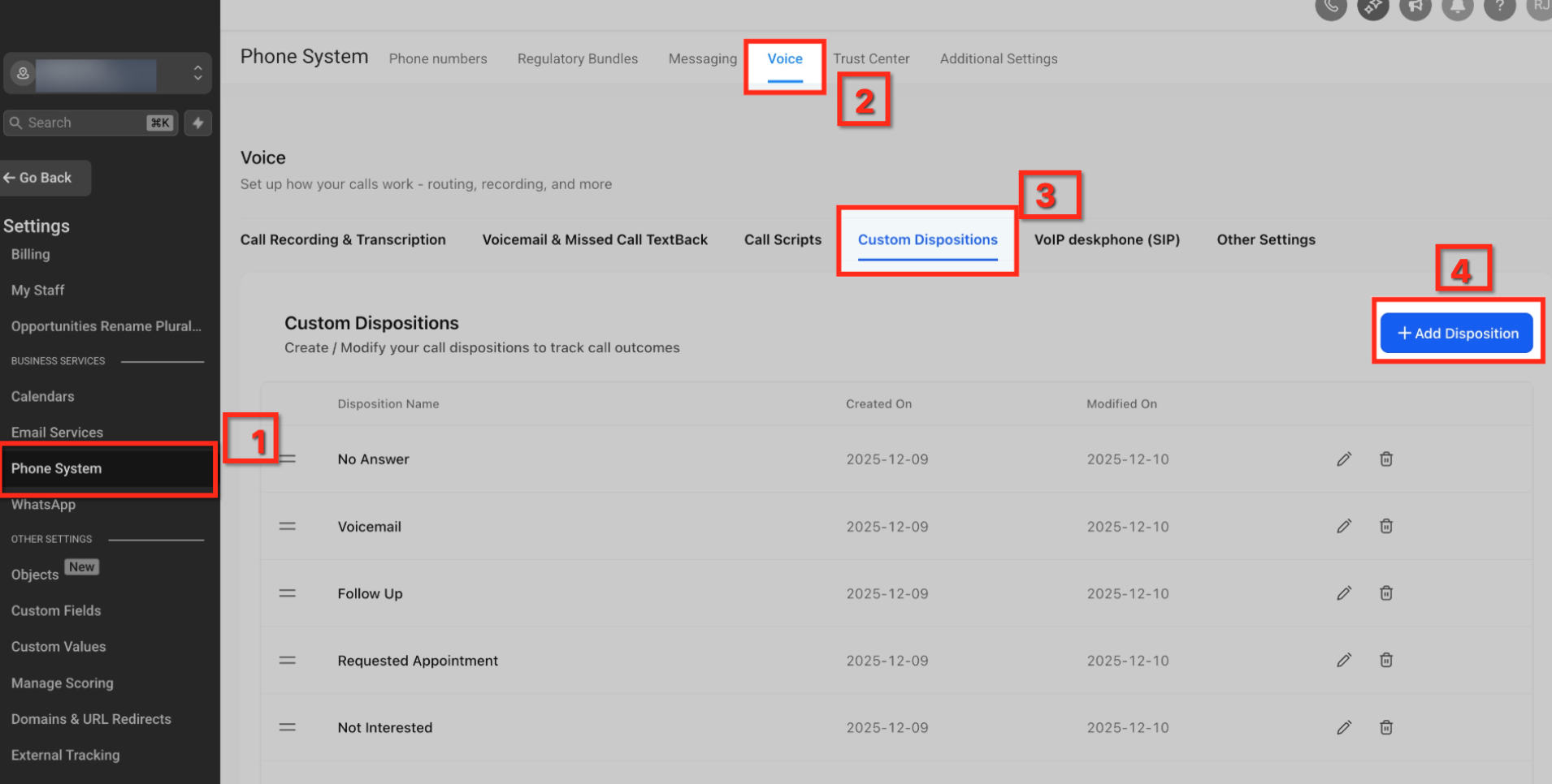 Go to Settings → Phone System → Voice → Custom Dispositions.