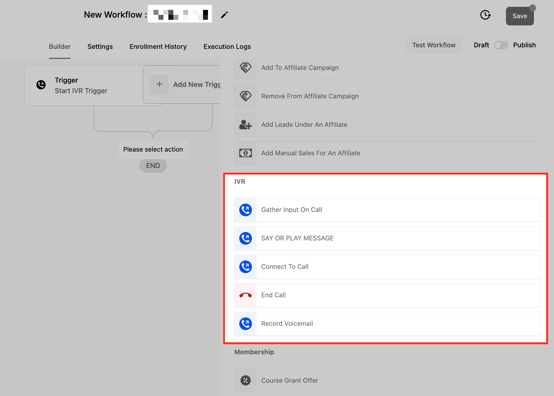 - Start by creating a new Workflow and choose the Start IVR Trigger.