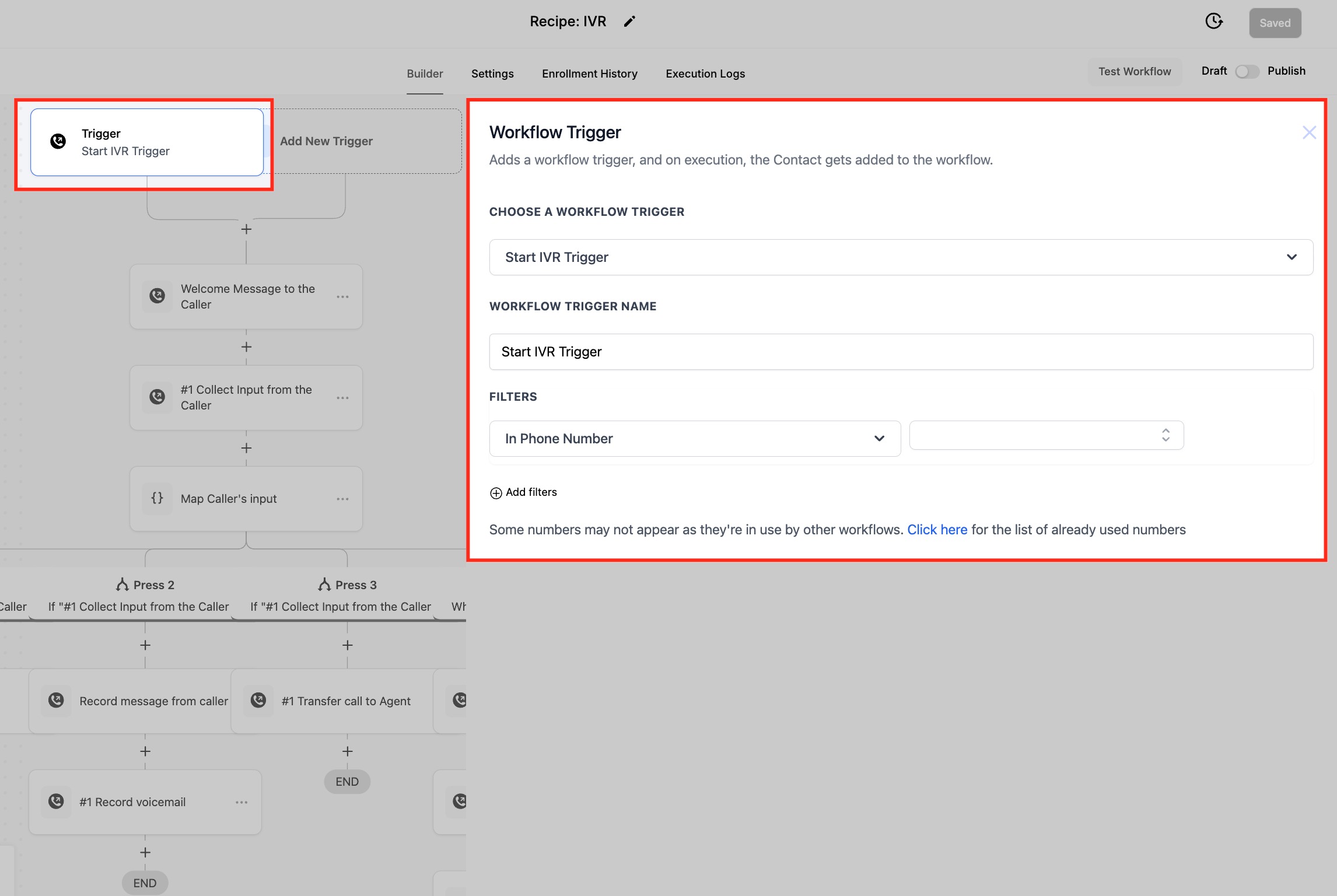 Constraint: One phone number can be mapped to one IVR workflow at a time.