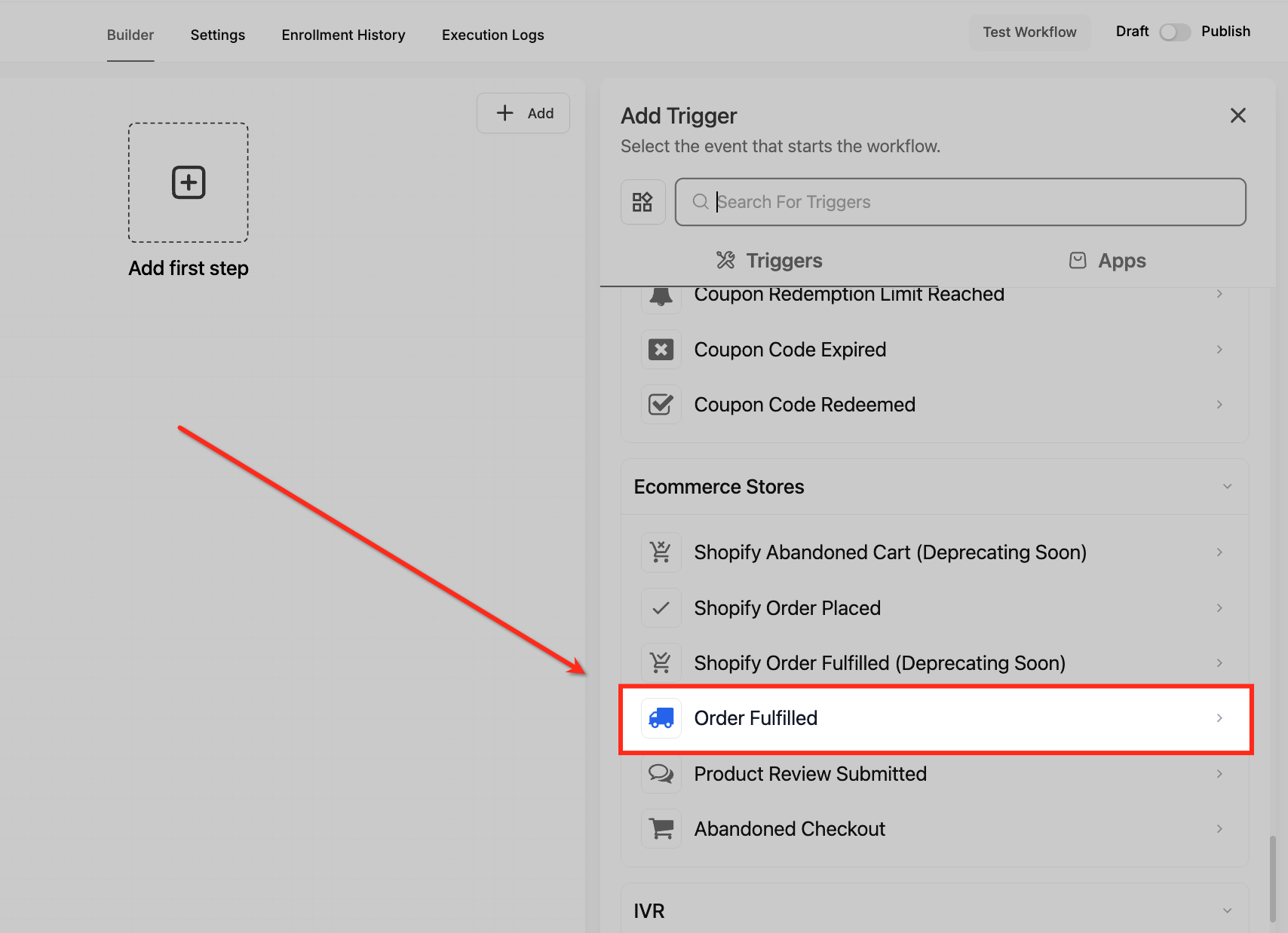 In the Add Trigger panel, scroll to Ecommerce Stores and select Order Fulfilled. This ensures the workflow starts the moment an order is marked fulfilled.