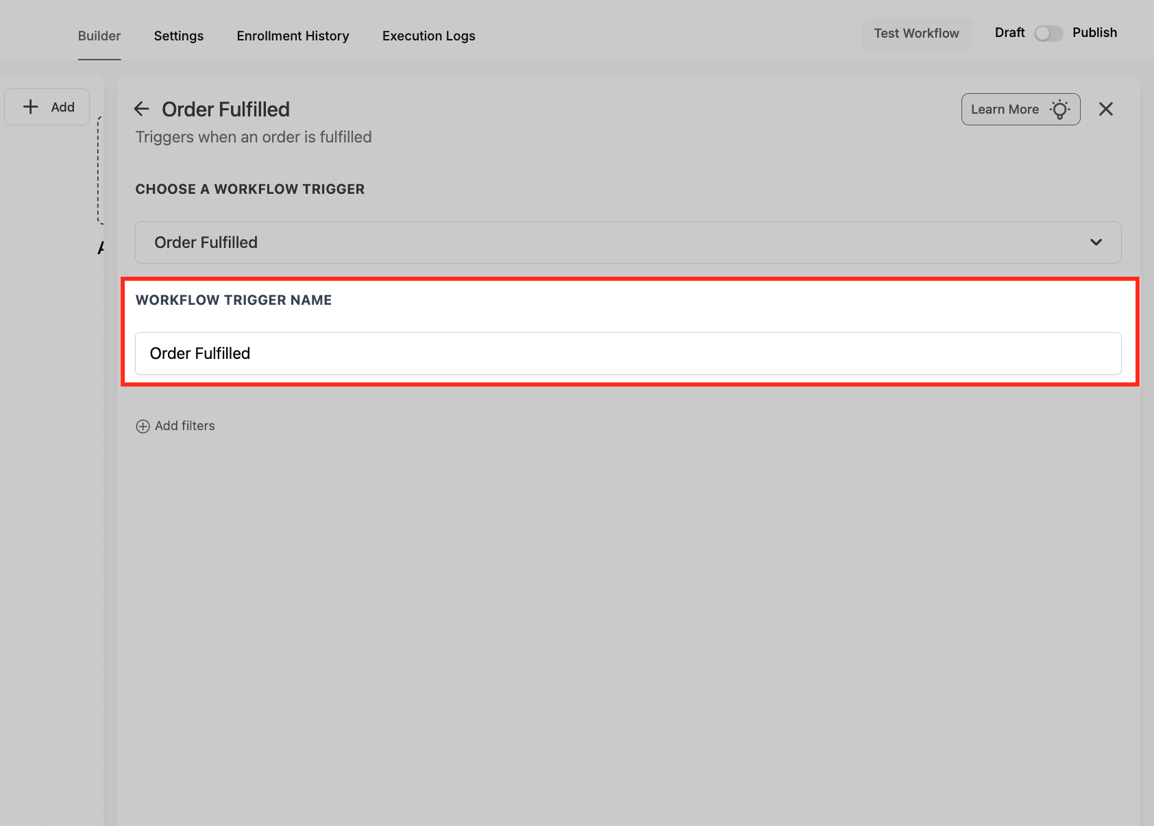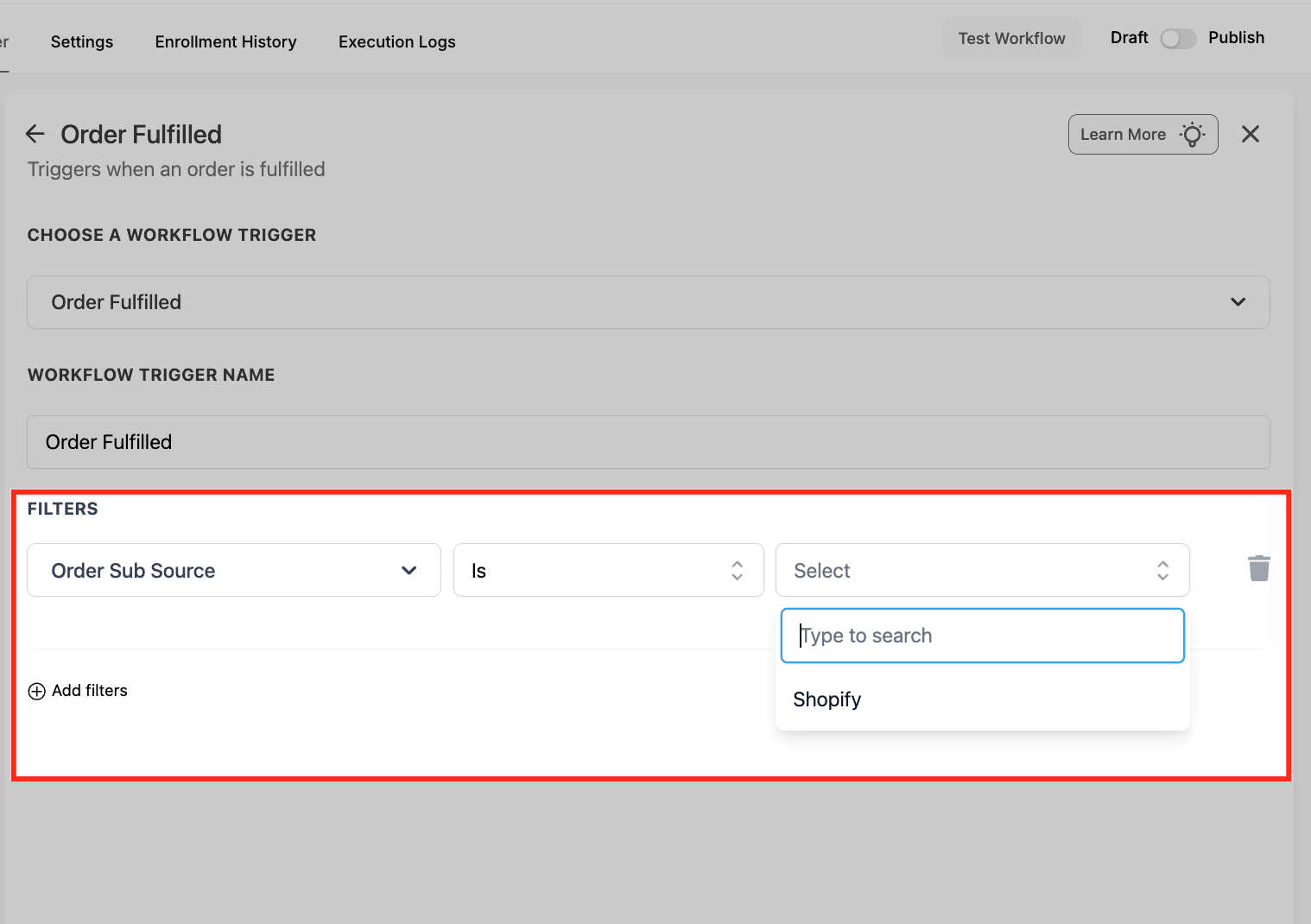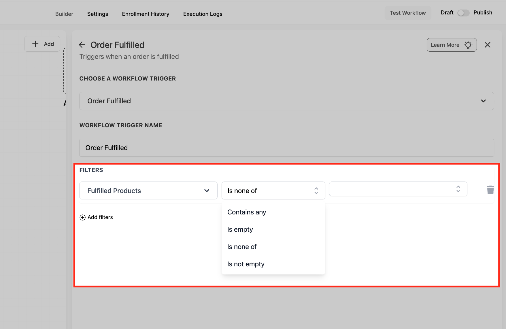 Under Filters, click Add filters to control which fulfillment events should enroll in the workflow. Using filters helps you avoid unnecessary enrollments and keeps your follow-ups relevant to the order details.