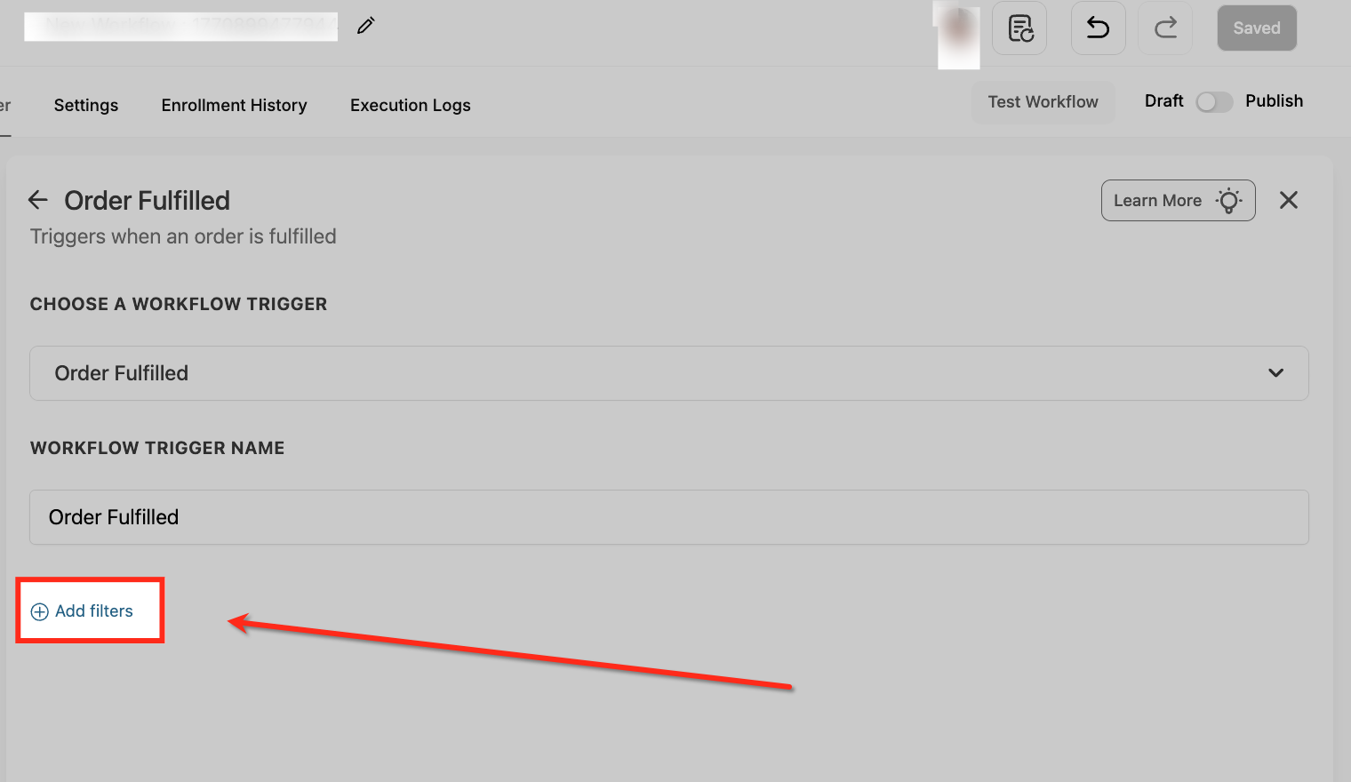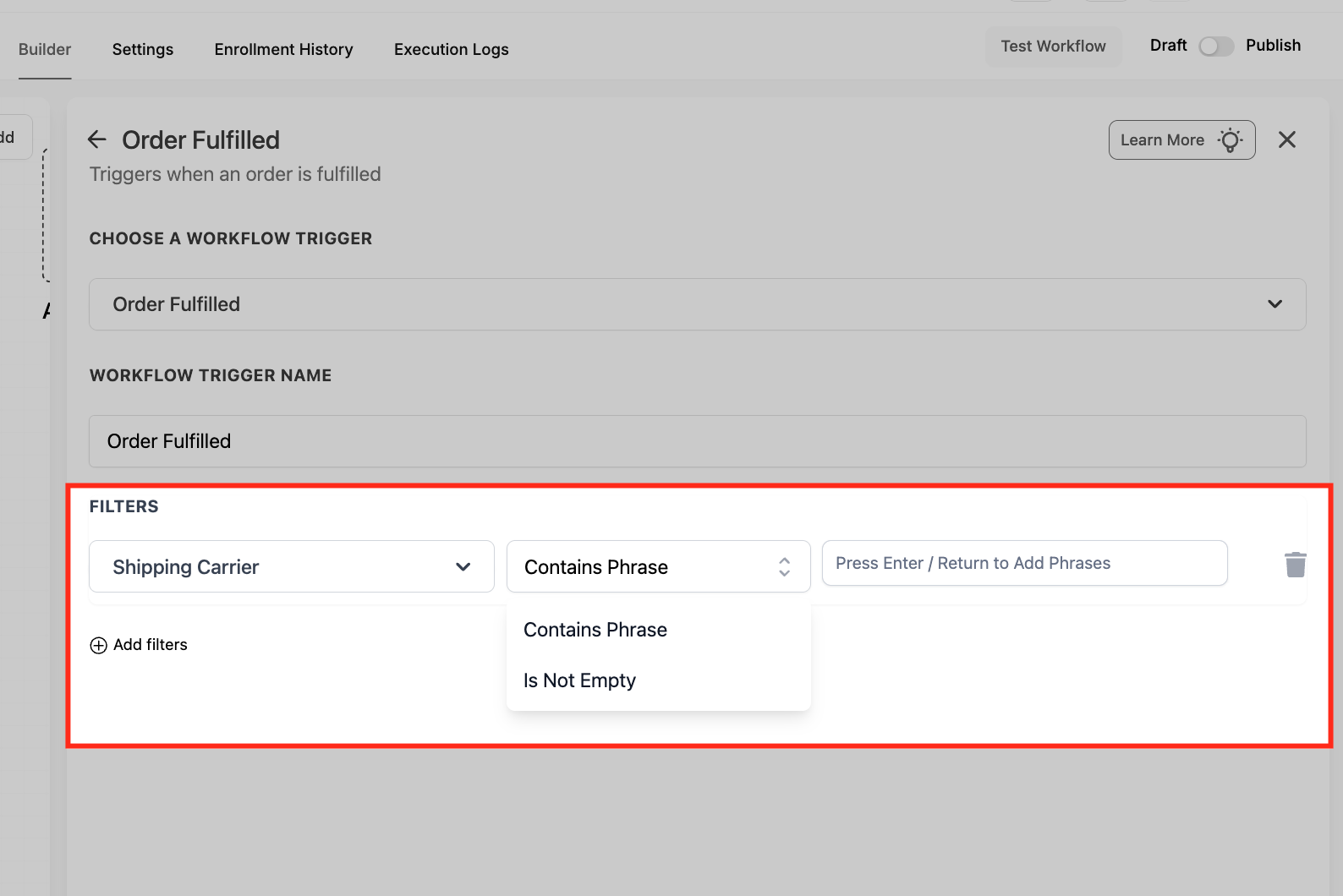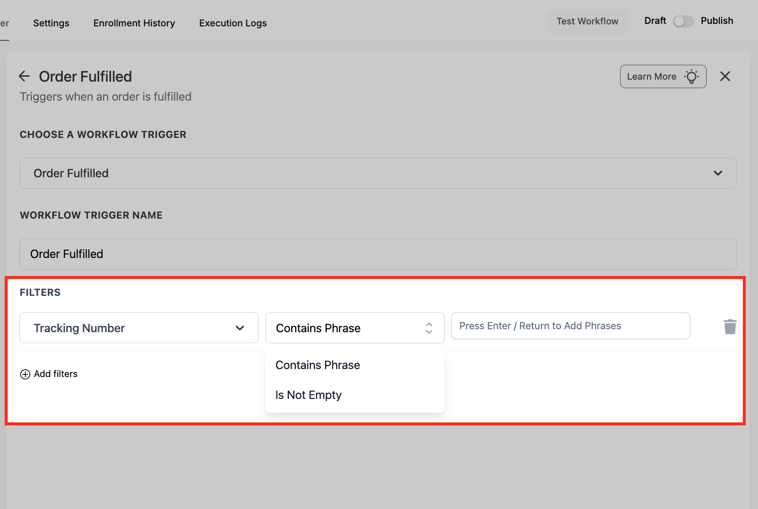 Under Filters, click Add filters to control which fulfillment events should enroll in the workflow. Using filters helps you avoid unnecessary enrollments and keeps your follow-ups relevant to the order details.