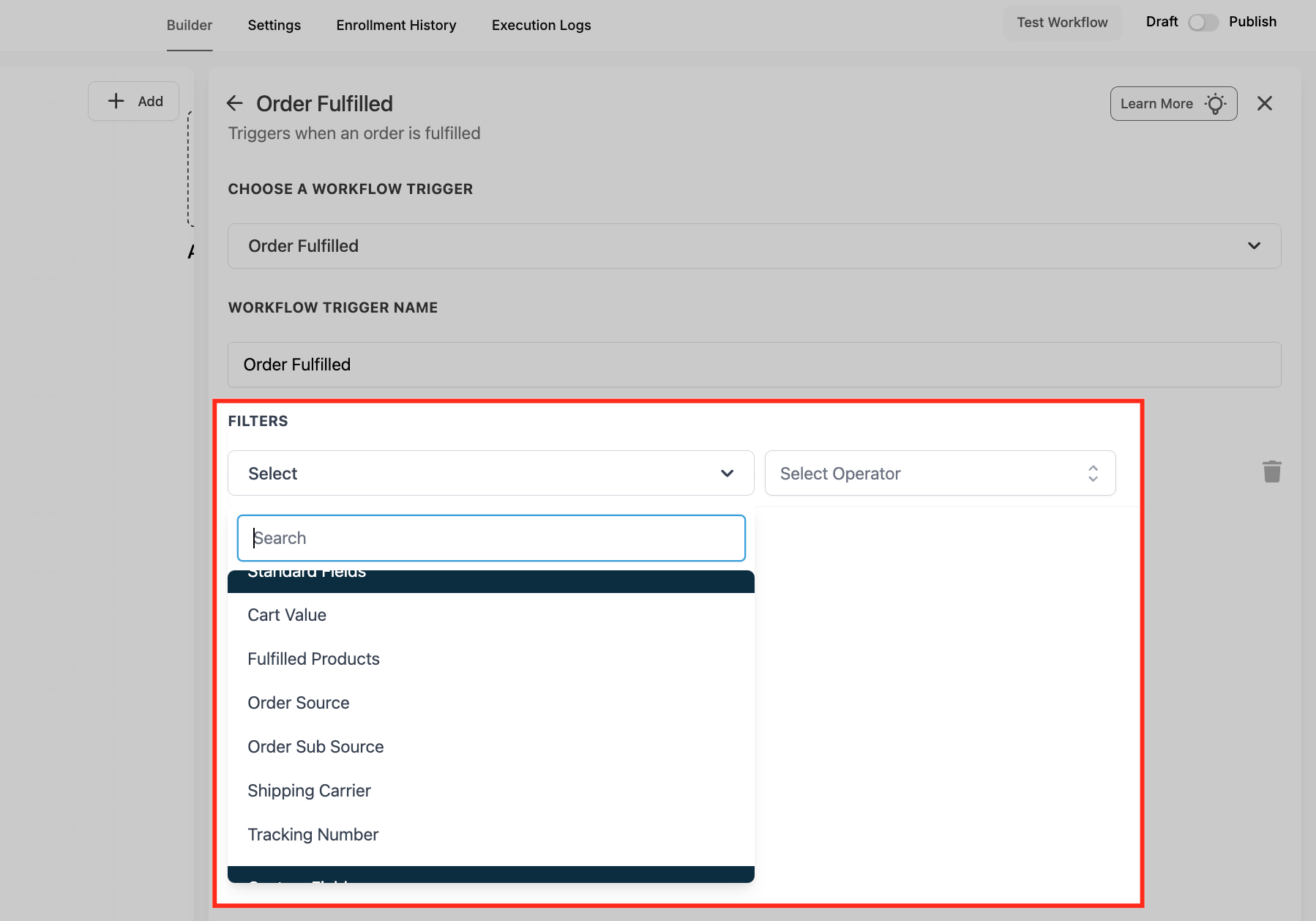 Open the filter dropdown and select the first condition you want to apply (for example, Cart Value or Order Source). Choosing the right filter type is what tells HighLevel which part of the fulfillment data to evaluate.