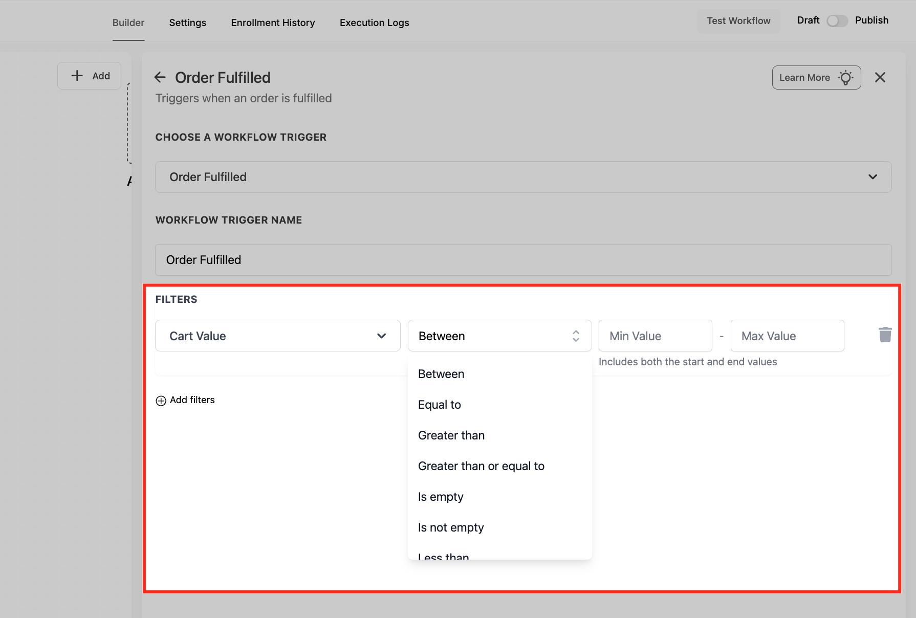 Choose Cart Value from the filter list to target orders based on how much the customer spent. This is a simple way to route higher-value purchases into VIP follow-ups or exclude low-value orders from certain automations.
