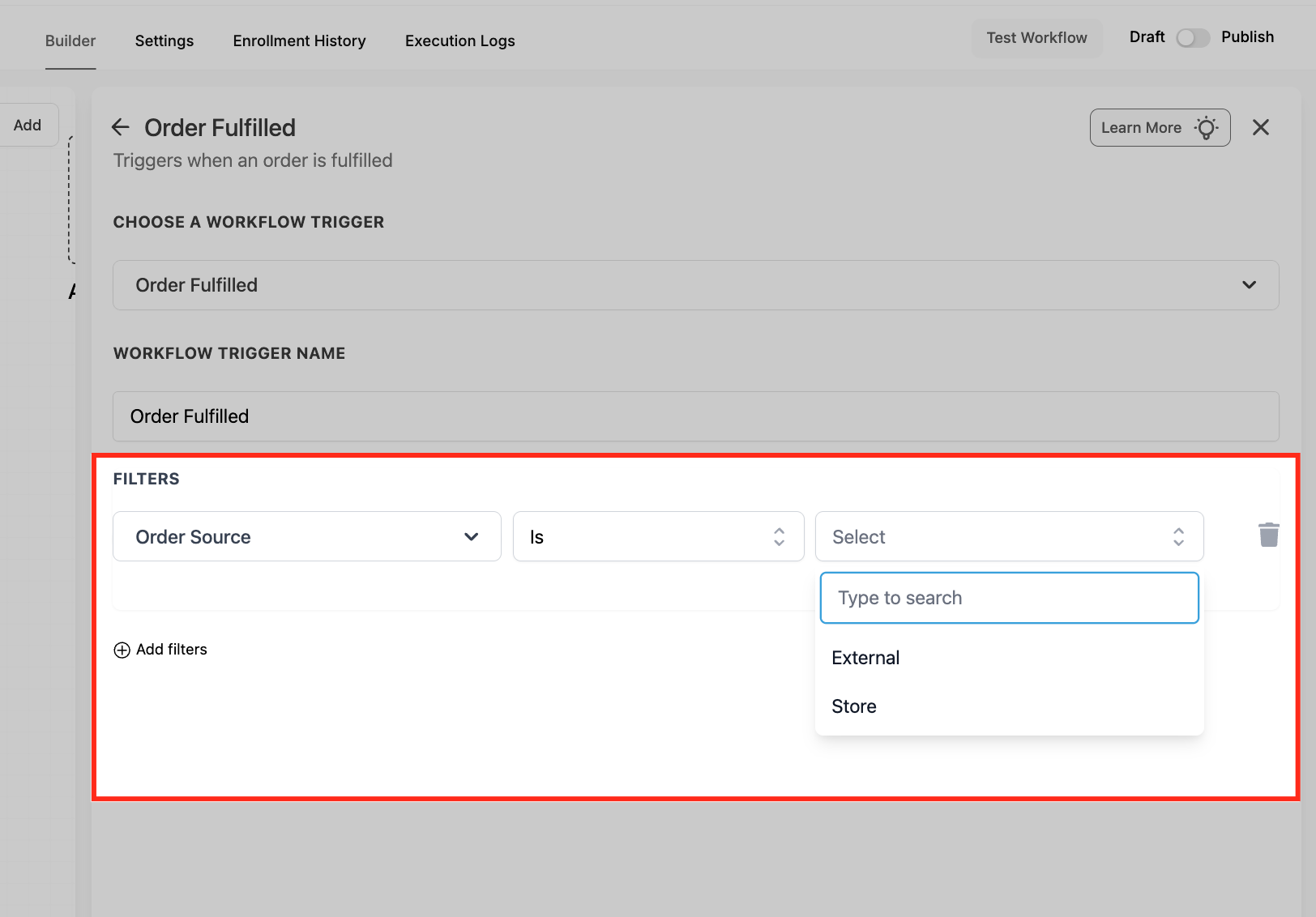 If you set Order Source to External, use Order Sub Source to narrow the trigger to a specific platform like Shopify. This keeps external order automations precise while still using the unified Order Fulfilled trigger.