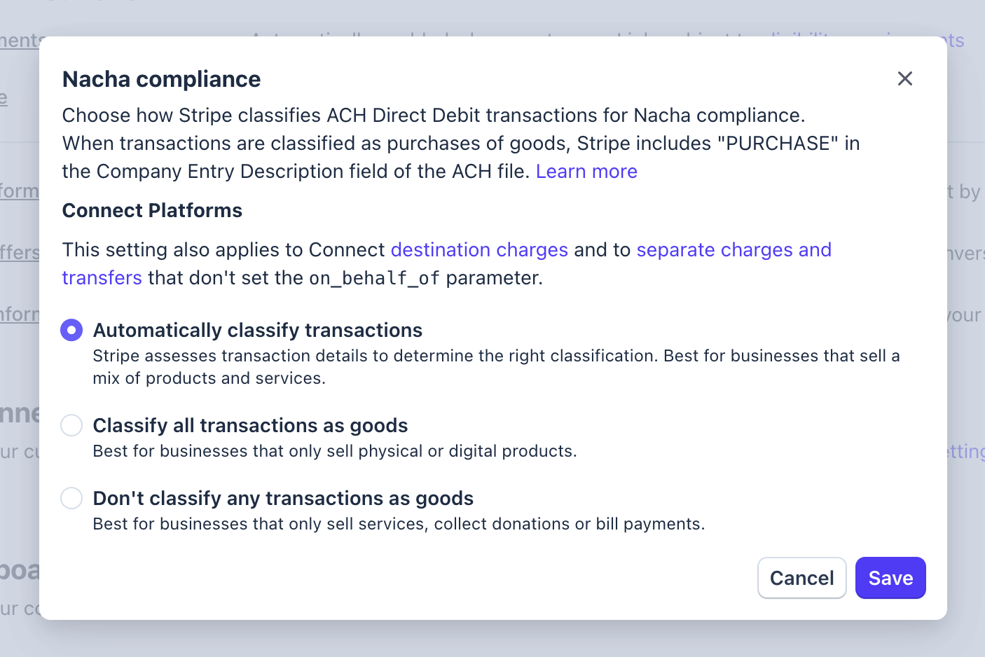 Stripe determines whether each transaction represents a purchase of goods based on available signals such as merchant information and transaction details. This works for most businesses and requires no code changes.Classify all ACH transactions as goods