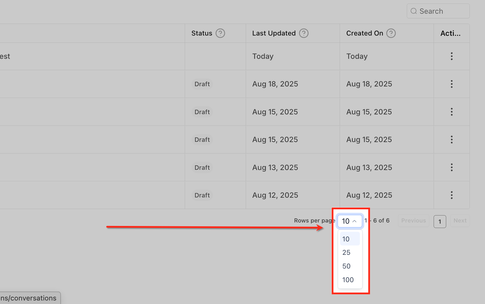 Use the Rows per page dropdown at the bottom of the list to control how many agents appear on screen. Choose between 10, 25, 50, or 100 rows to match your workspace preference.