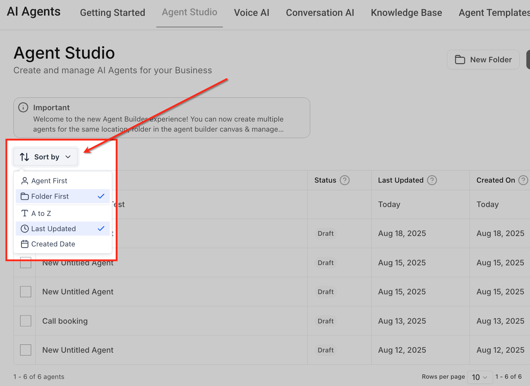Click the Sort by dropdown to adjust how agents are displayed. You can toggle between Agent First or Folder First, and sort by Name, Last Updated, or Created Date.