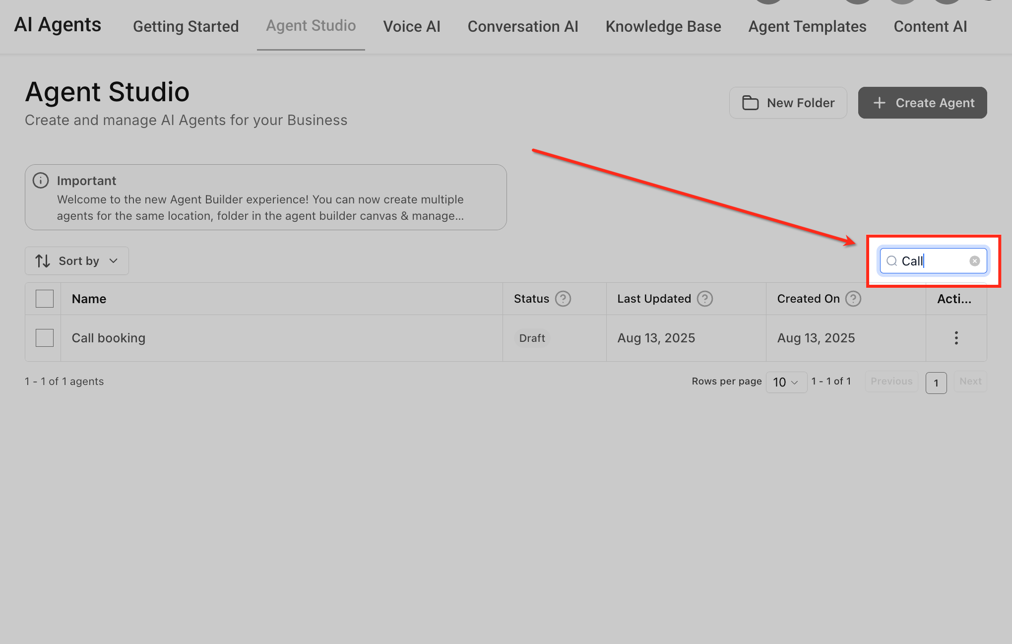 Use the Search bar in the upper-right corner to quickly filter agents by name. Results update instantly, helping you locate specific agents even in large libraries.
