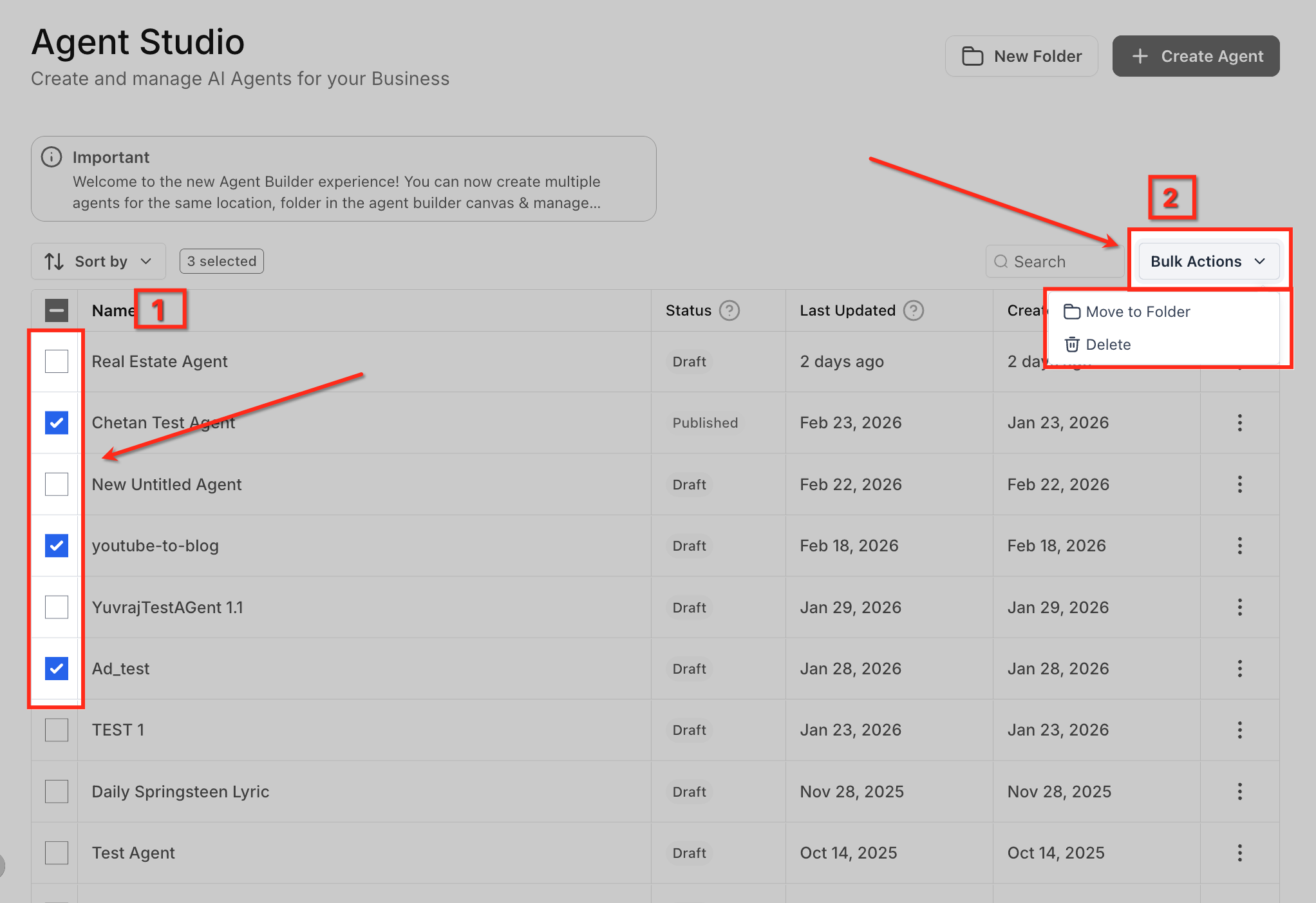 - Click the Bulk Actions dropdown in the top-right corner after selecting agents. From here, choose Move to Folder or Delete to apply changes to all selected items at once.